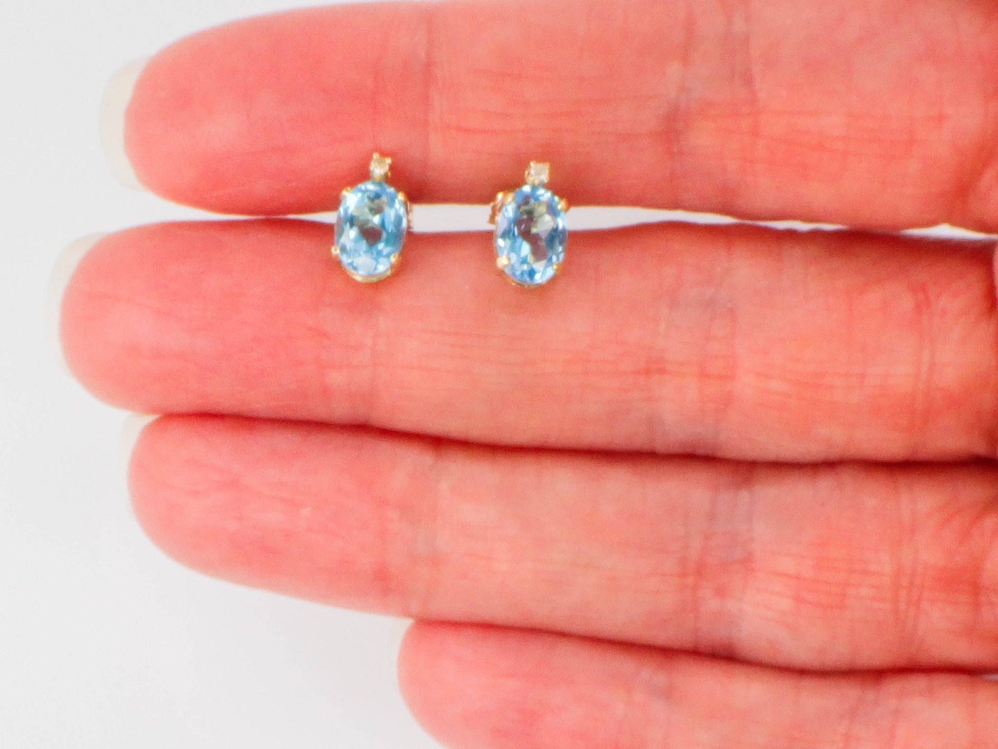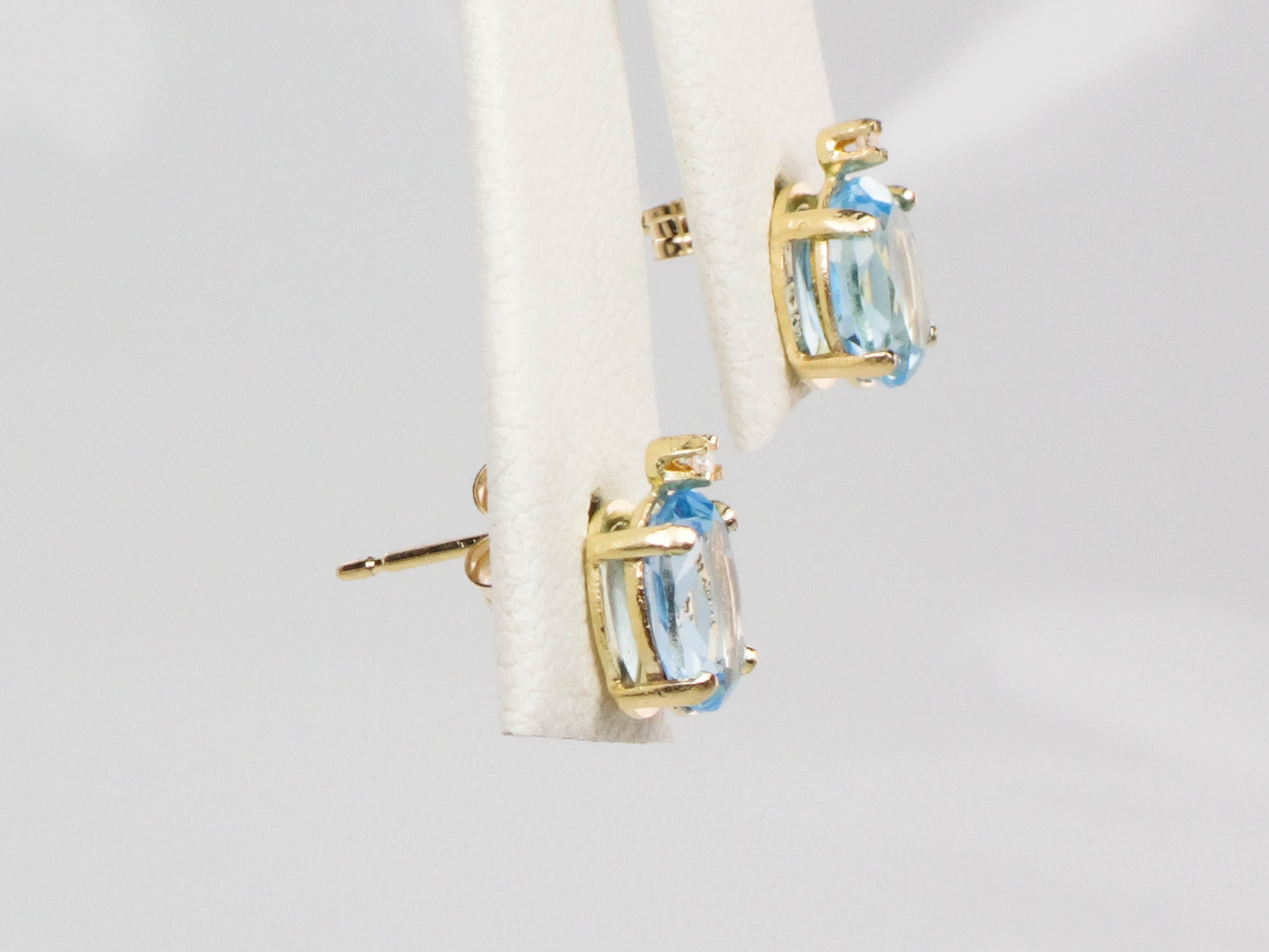 Add a touch of sophistication to any outfit with these pre-owned 14k yellow gold blue topaz stud earrings! The stunning oval blue topaz stones are accented with white sapphires for an extra hint of sparkle. Perfect for December birthdays or anyone who loves a pop of color.