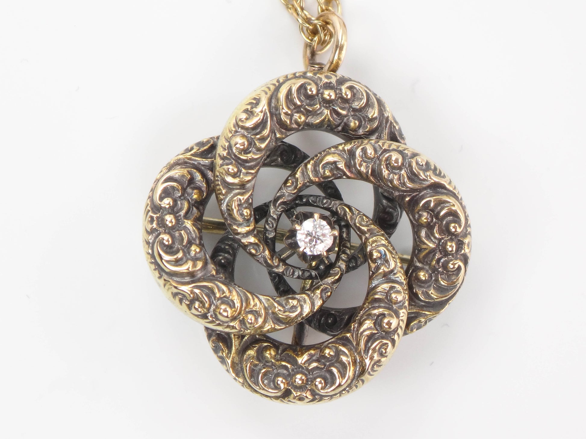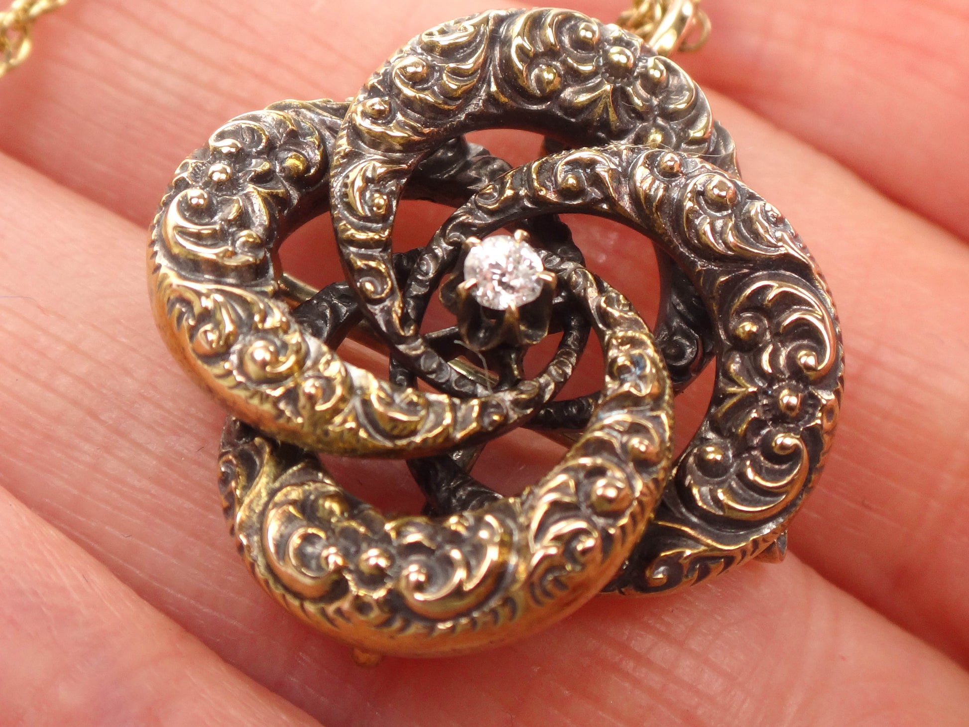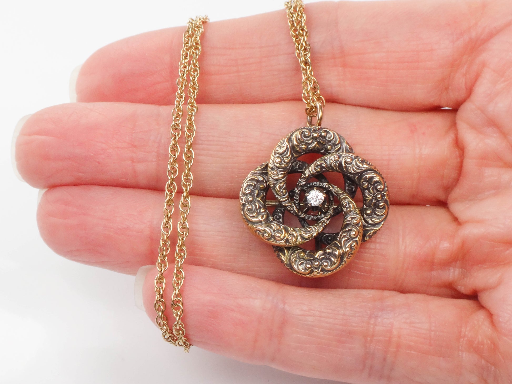 This exquisite Victorian 14k gold pendant necklace or pin embodies the timeless elegance of the era. Adorned with a sparkling diamond the Repousse love knot adds a touch of sophistication to any outfit. Versatile and unique, it can be worn as a necklace or pin, making it a must-have piece for the refined and discerning individual. The love knot pendant measures approximately 7/8" east to west and the natural Old Mine Cut diamond weighs approximately .05 carats. The pendant is unmarked and tests for 14k gold (not plated or filled). The chain that the pendant hangs on is vintage and gold filled. It measures approximately 20" in length. If worn as a pin there is a hook at the bottom that would allow for another piece to be hung if desired.