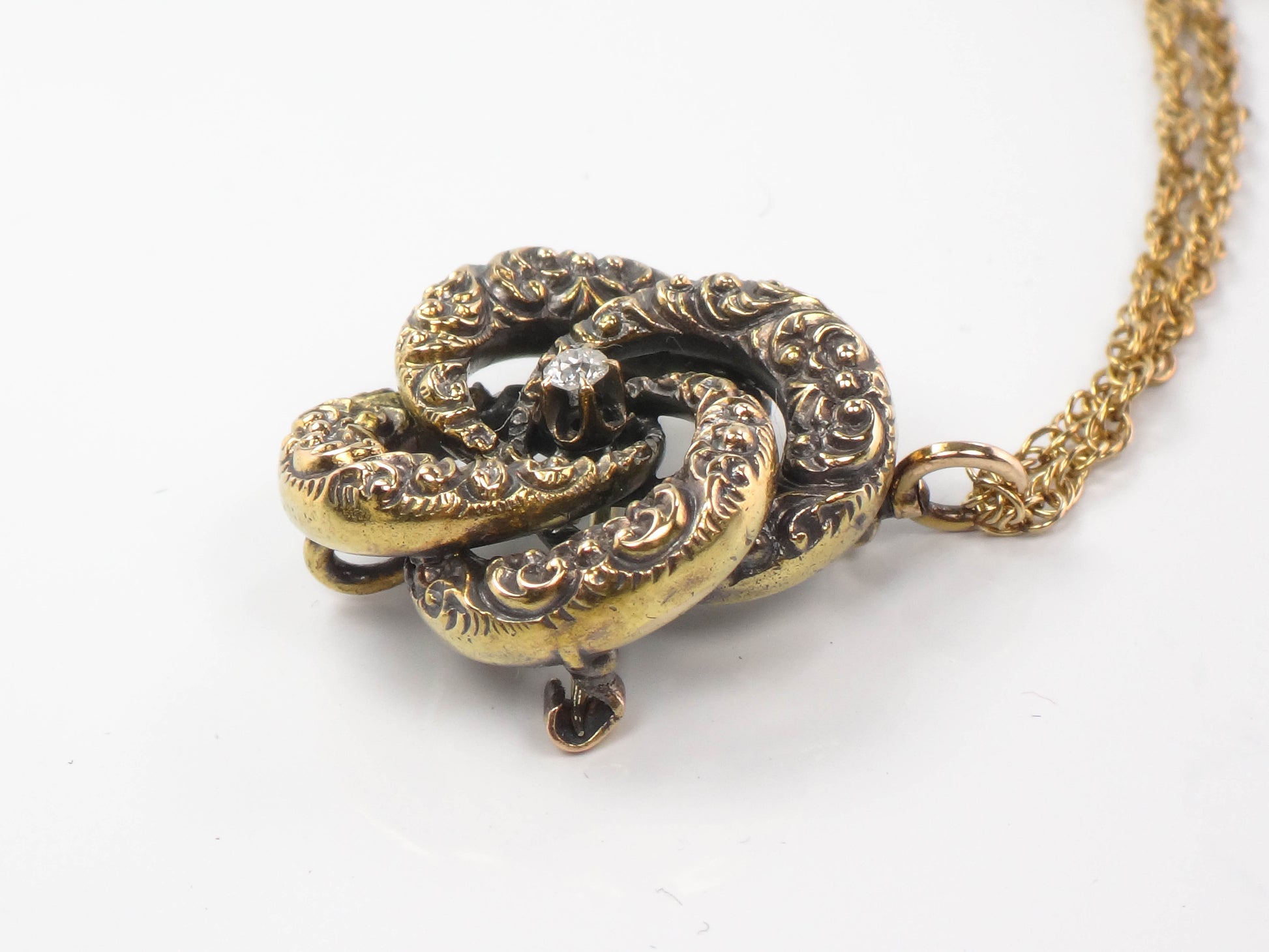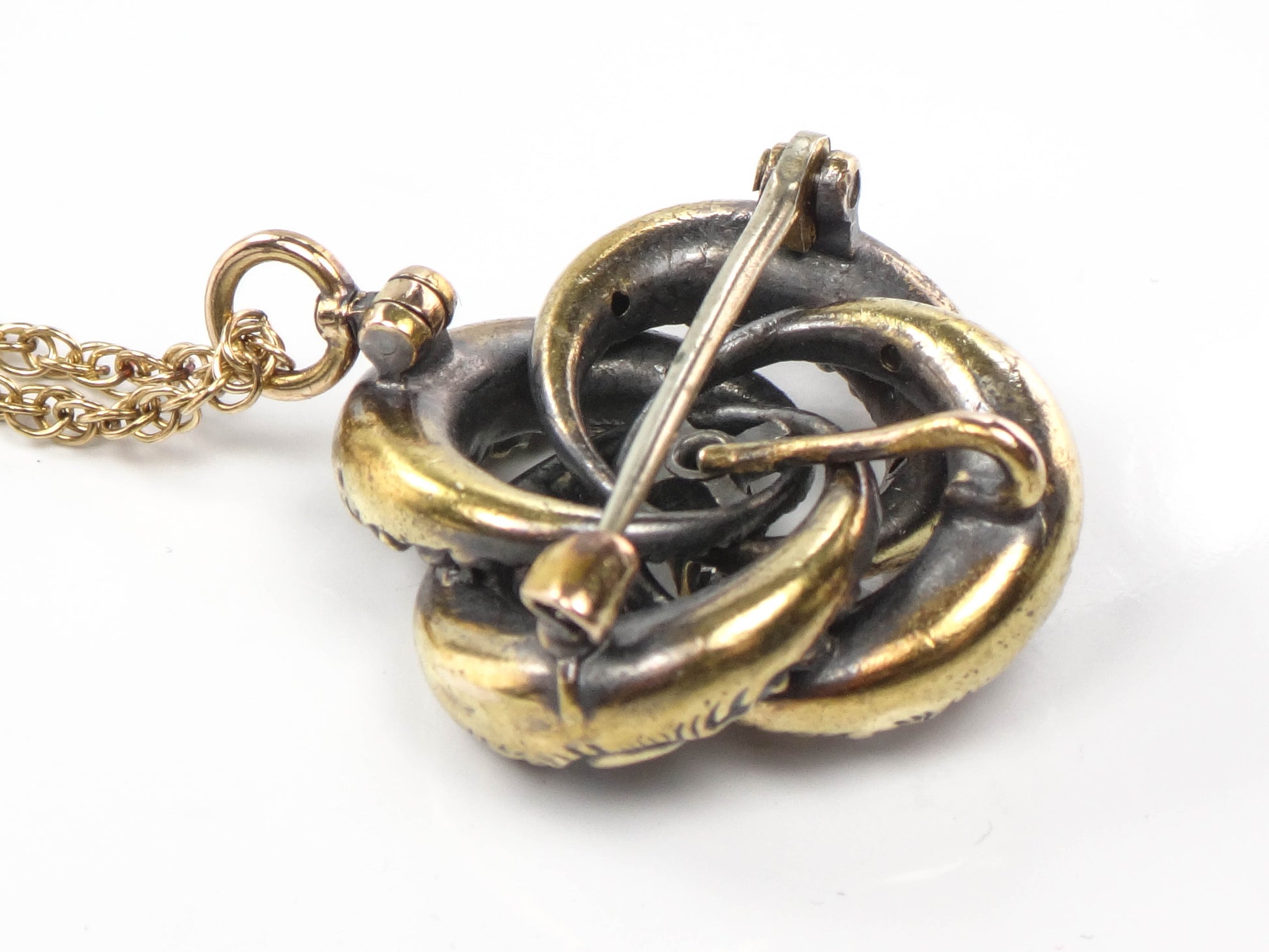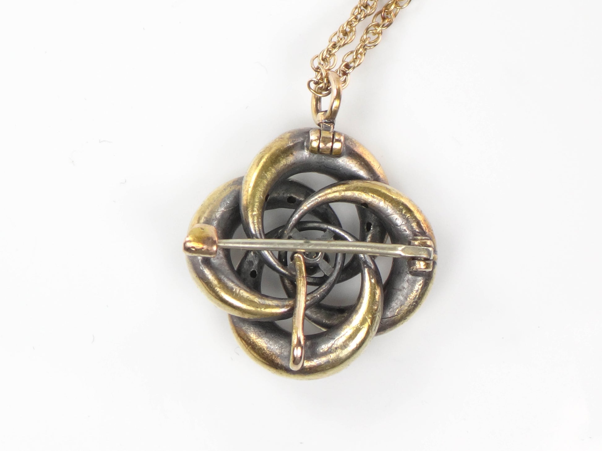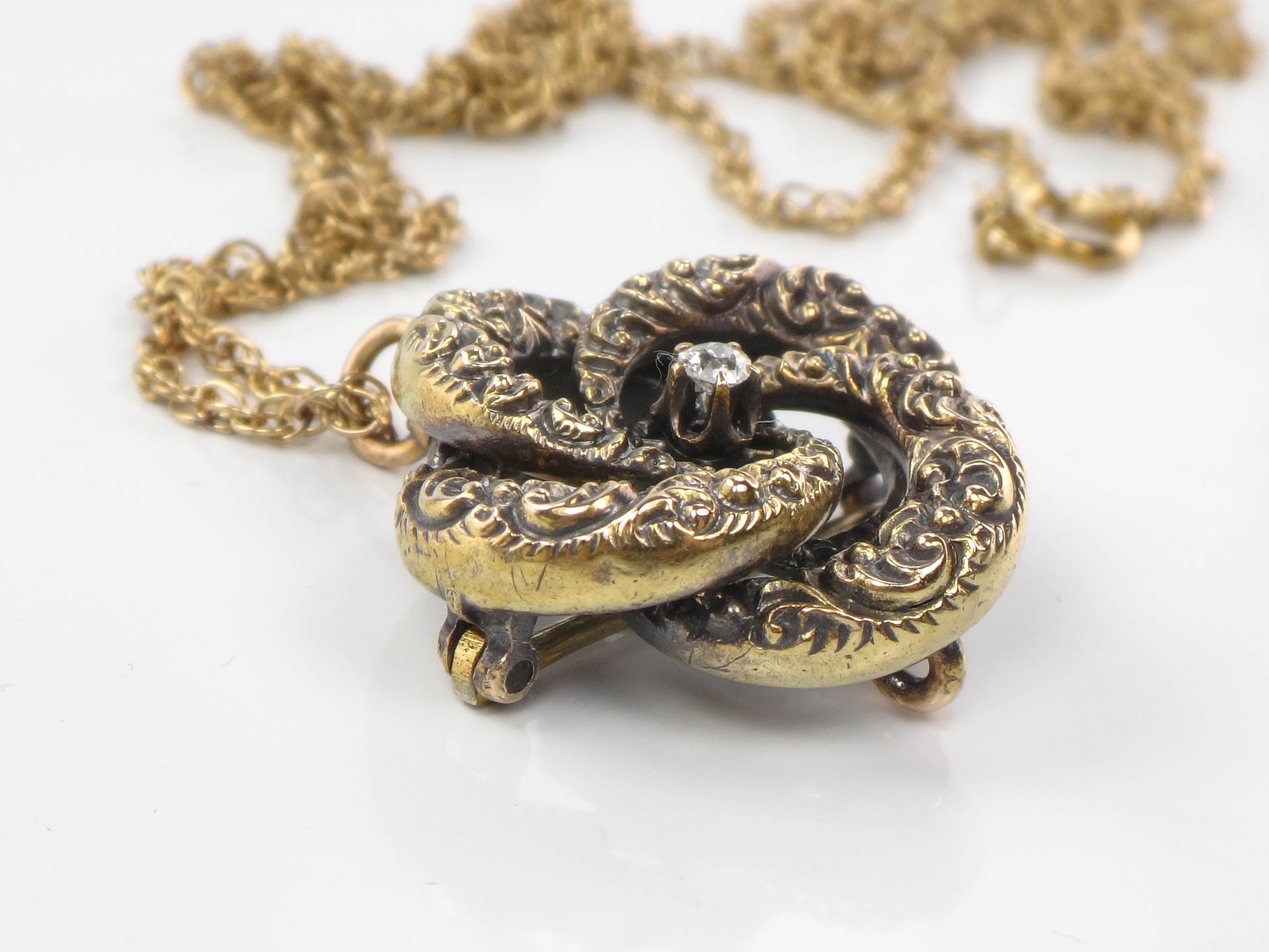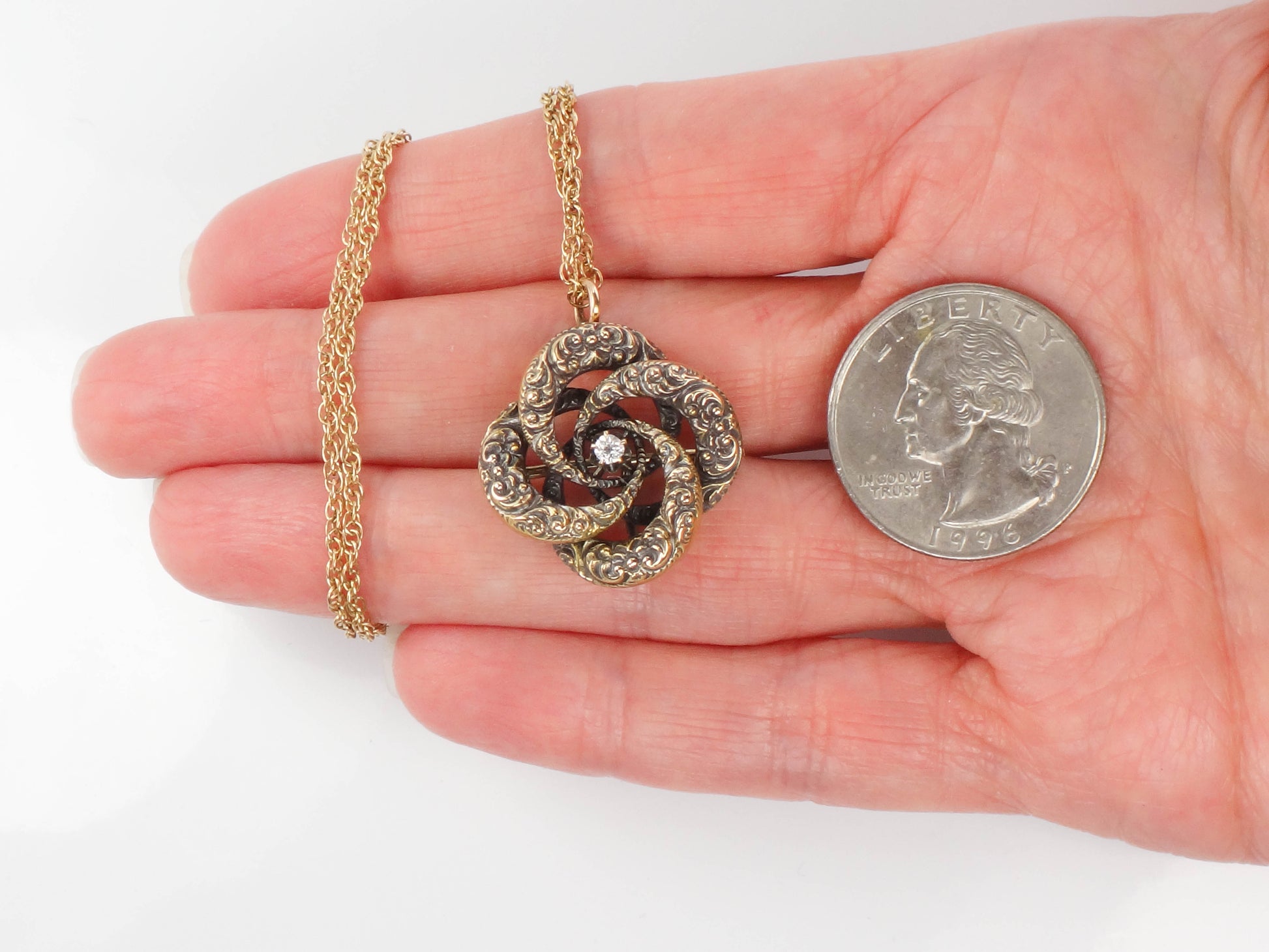 Victorian 14k Gold Old Mine Cut Diamond Love Knot Pendant Necklace 20" Antique Pin