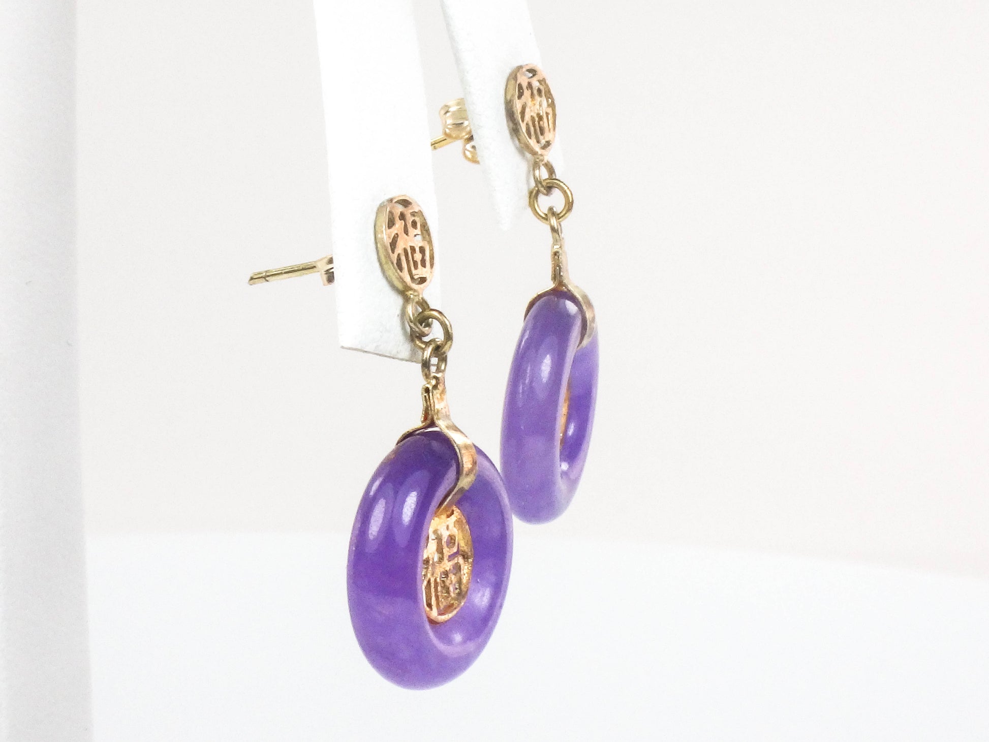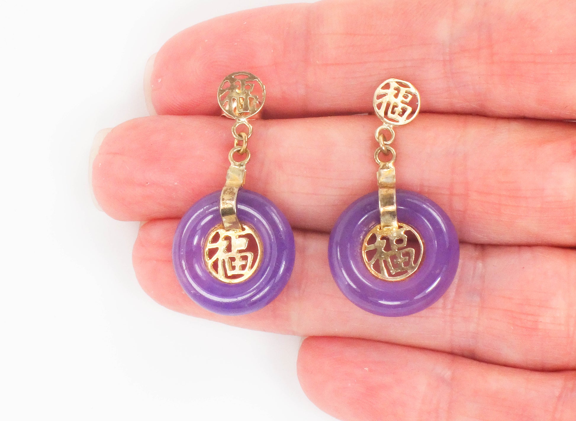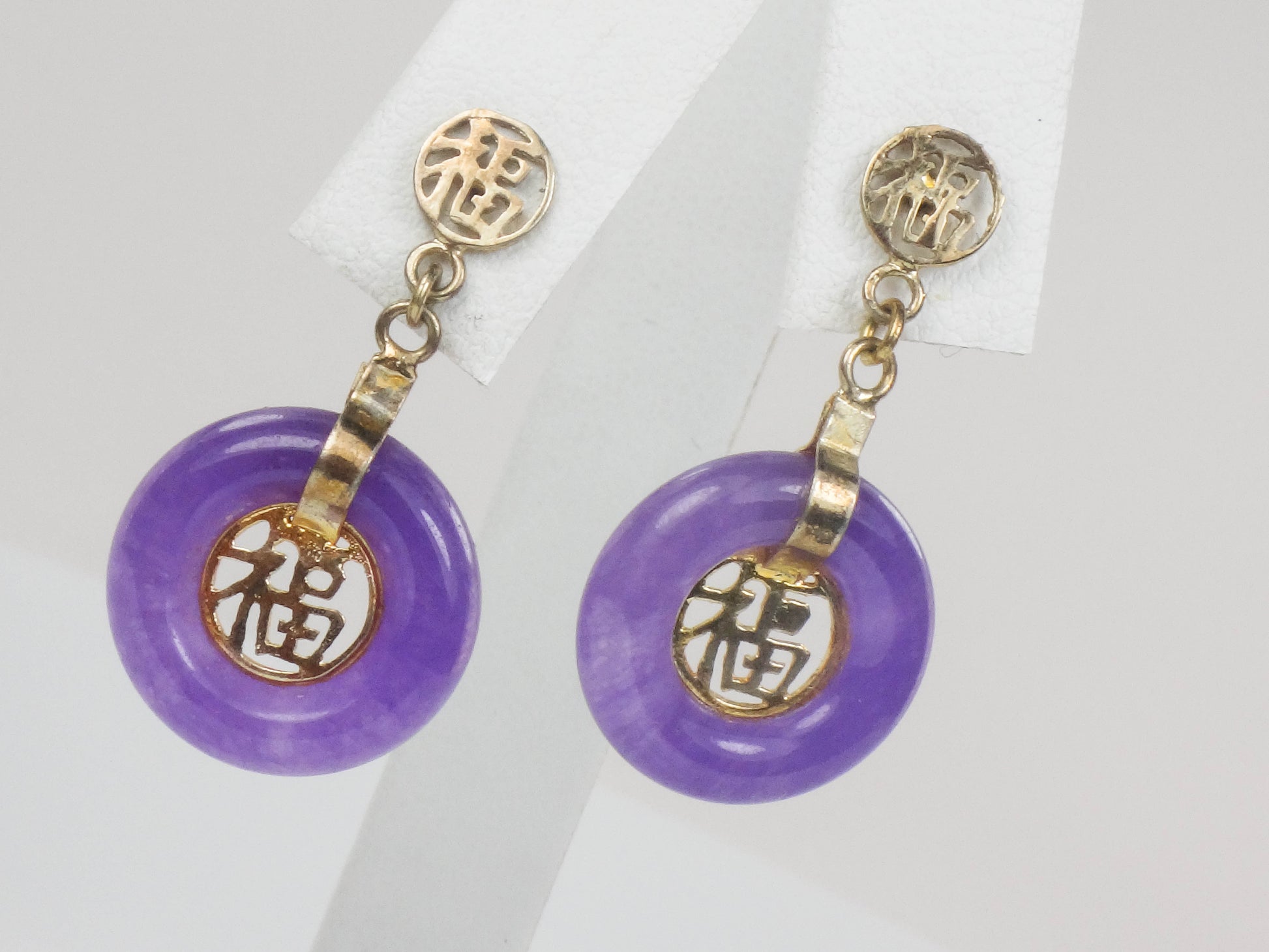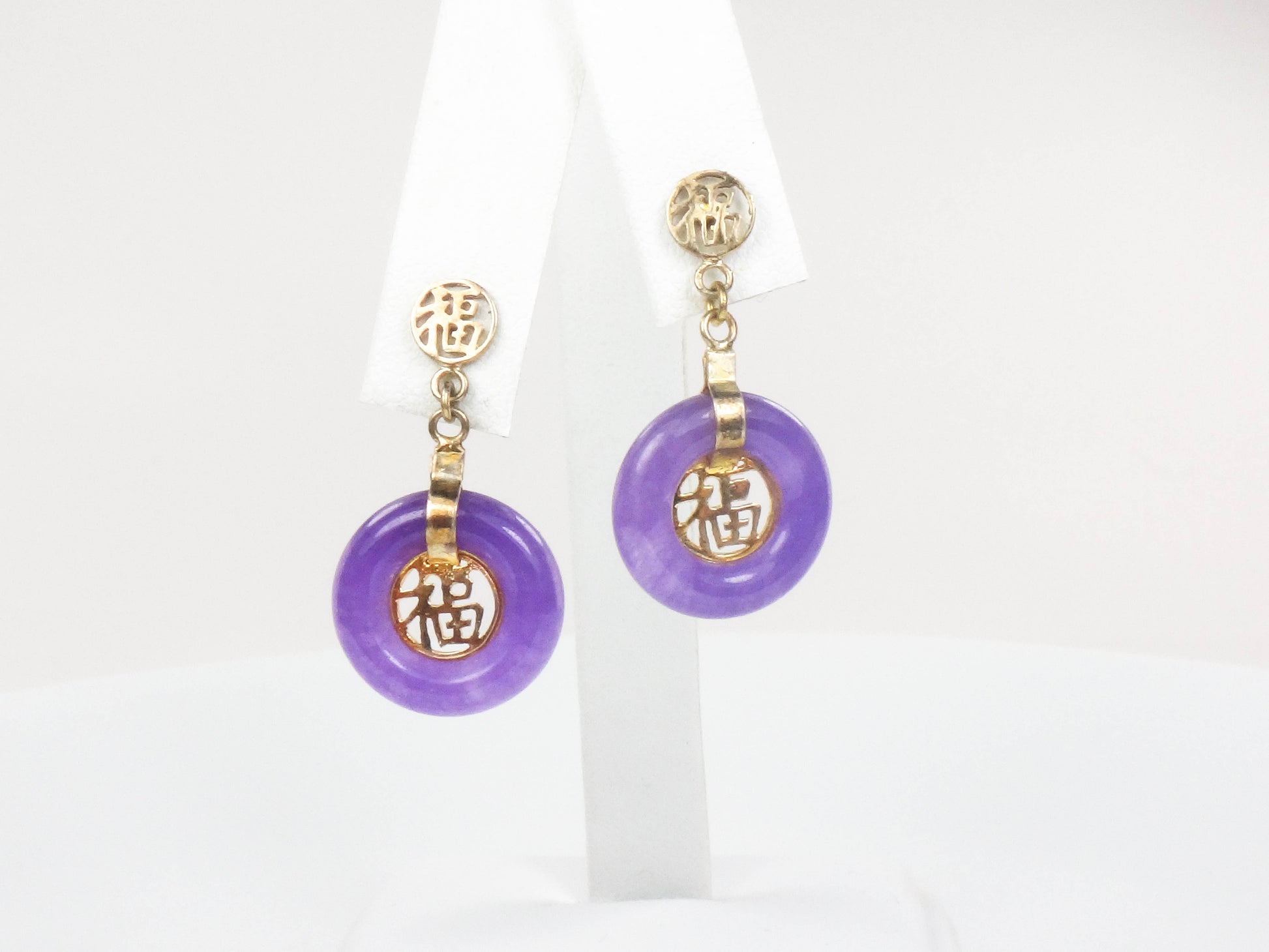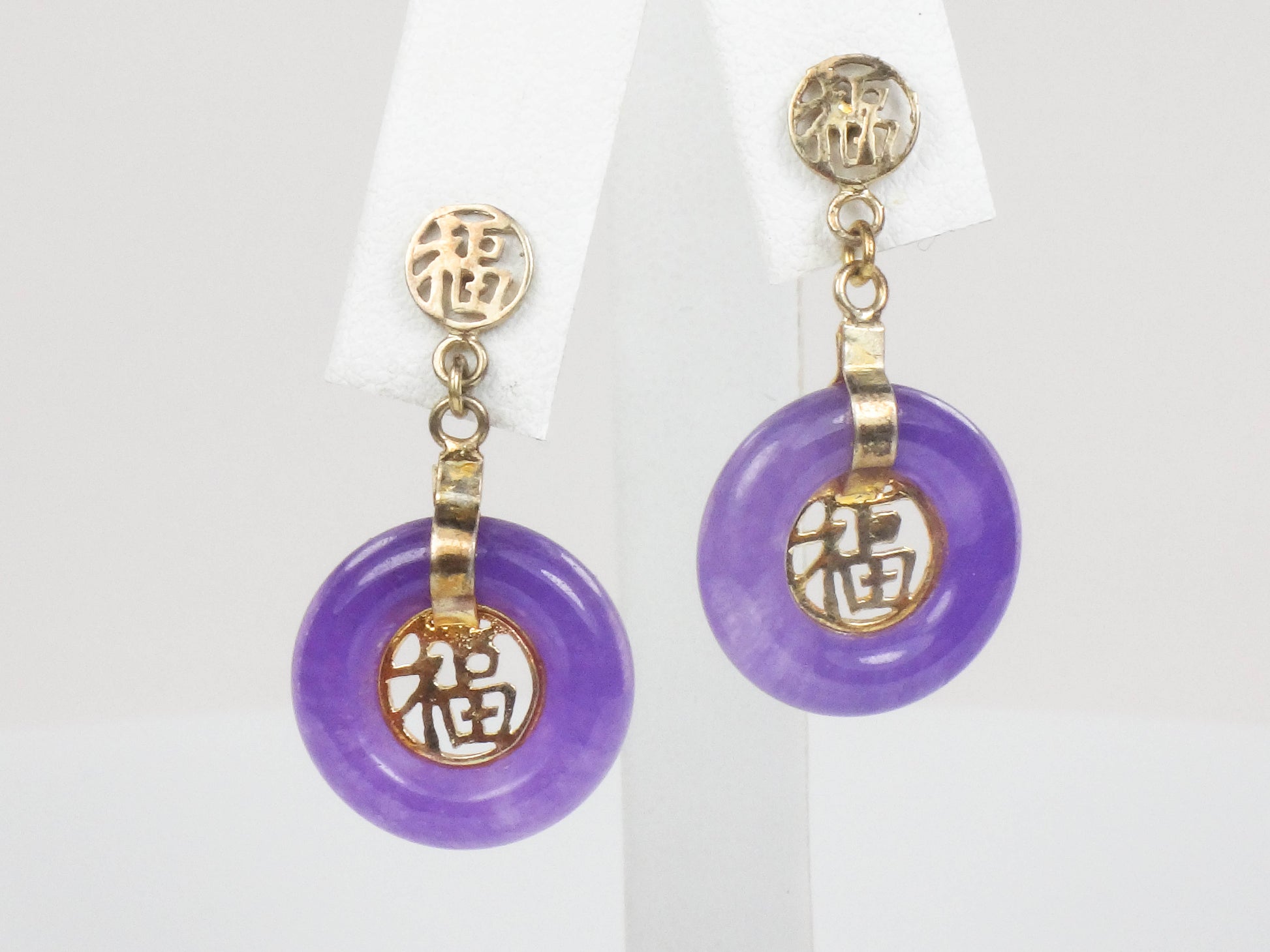 These Vintage Gold Plated Silver Jade Earrings are timeless! The earrings are gold in color (gold plated over silver) and each showcases a round lavender jade stone with a gold Chinese symbol at the center. The jade has deep purple color. The disc of jade has a gold-tone strap and another small Chinese symbol sits at the top of the earring. The earrings have post backs and the ear nuts are 14k solid gold (tested). The earrings are unmarked. These lovely earrings have classic style, beautiful color and are said to bring good luck. They are in good vintage condition and are ready to be worn and enjoyed!