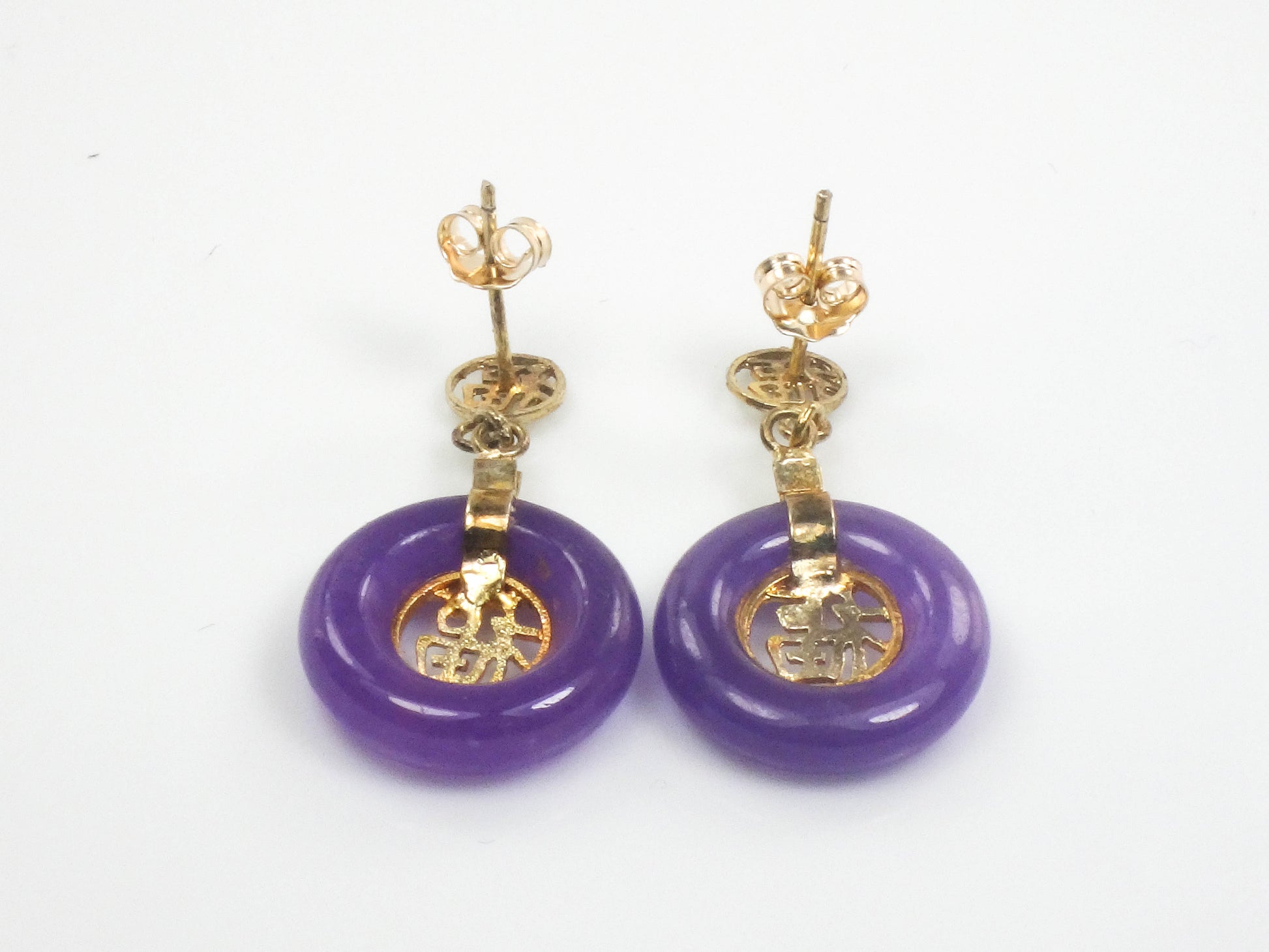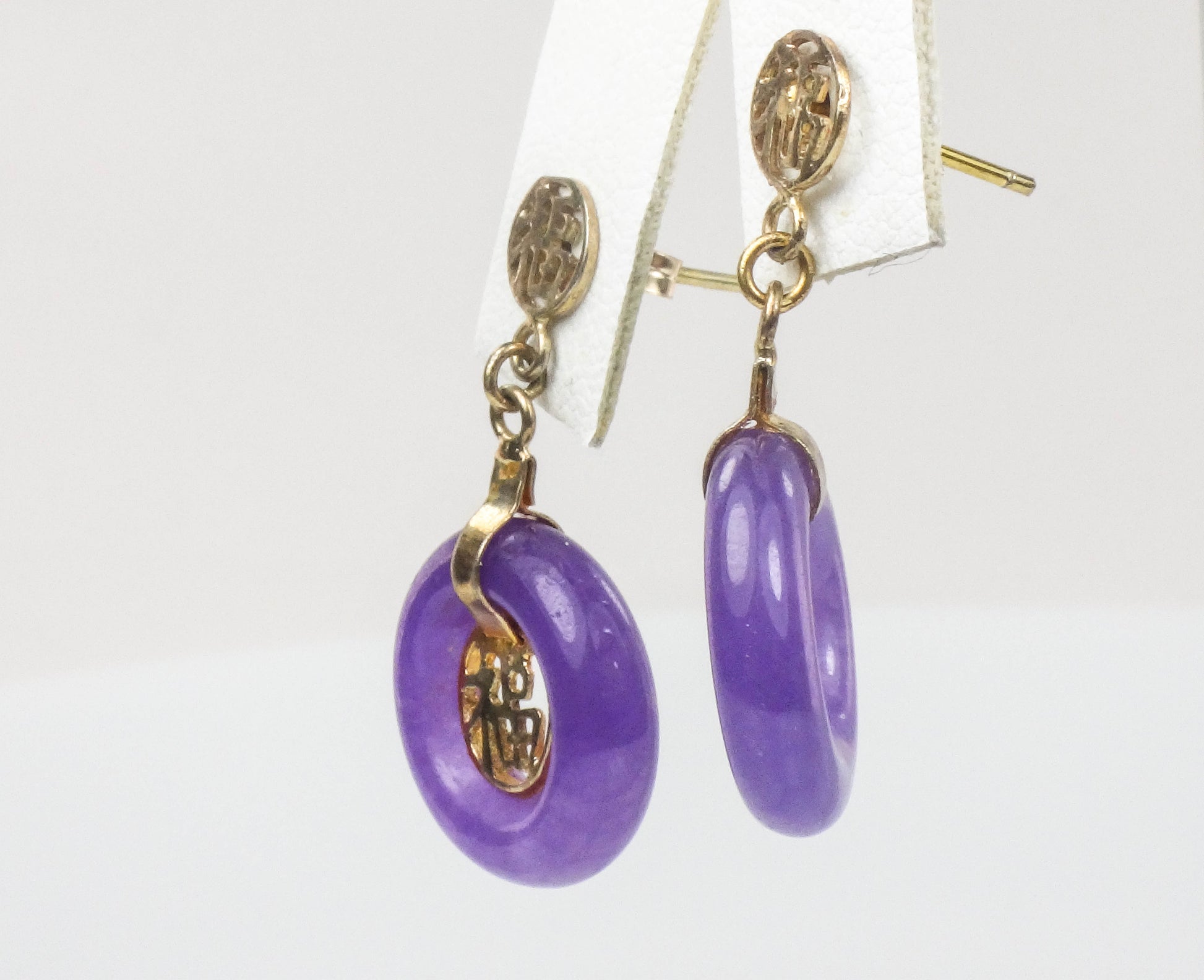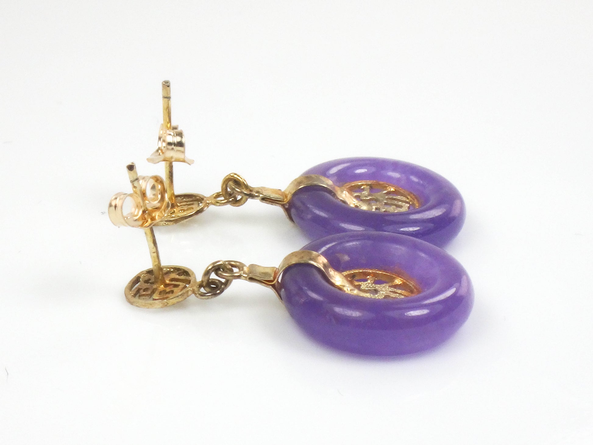 Vintage Gold Plated Silver Purple Lavender Jade Circle Dangle Earrings
