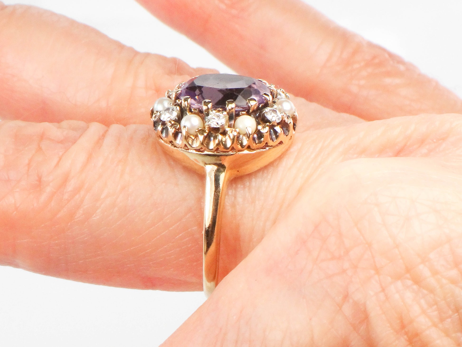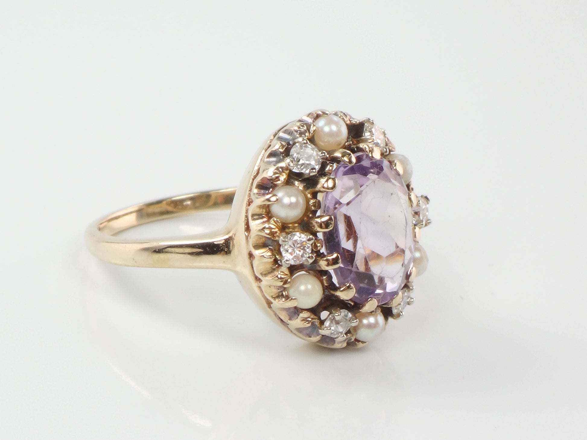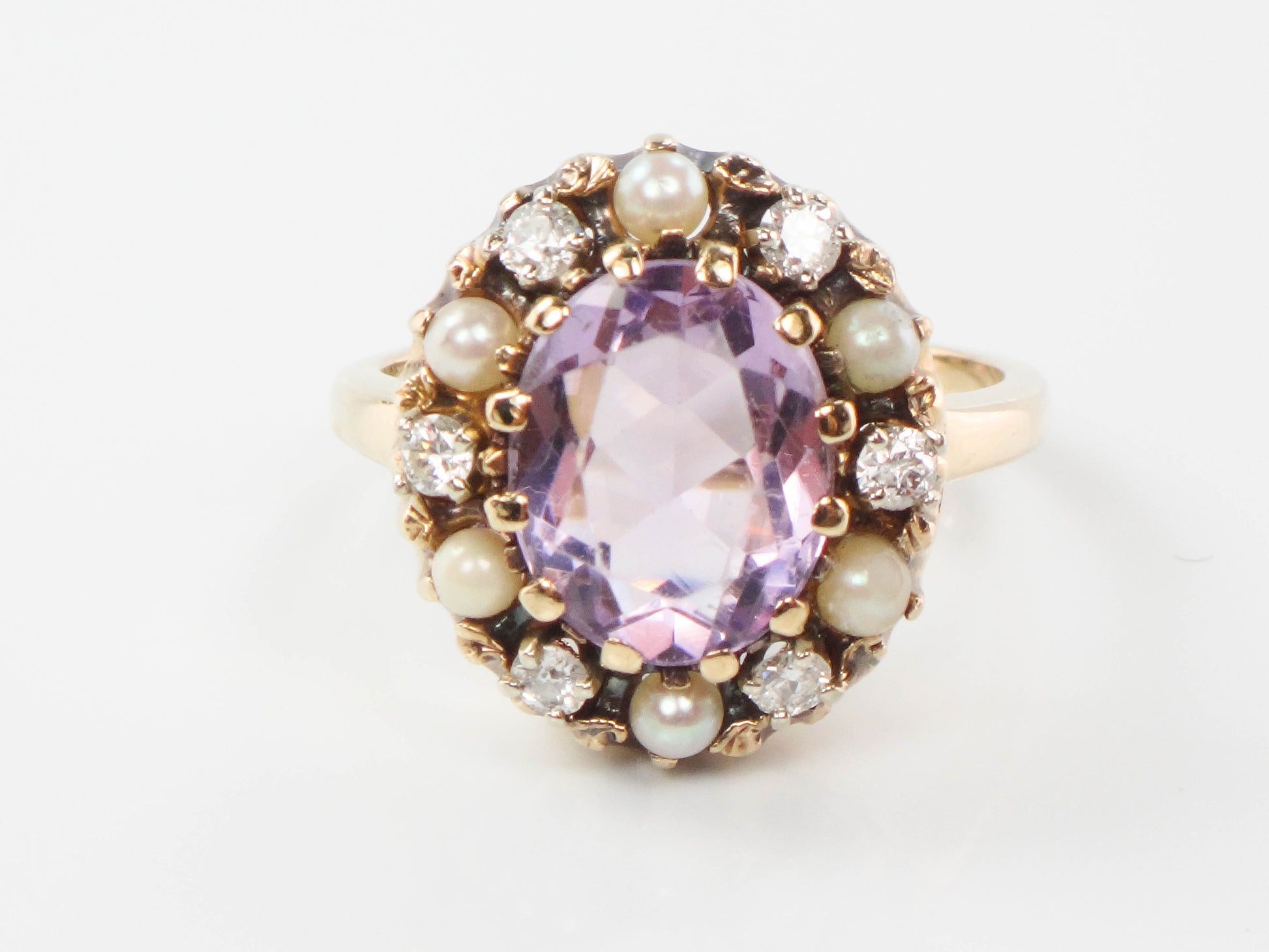 Vintage 14k Yellow Gold Pink Amethyst, Diamond and Pearl Halo Ring, Size 7 February Birthstone Ring