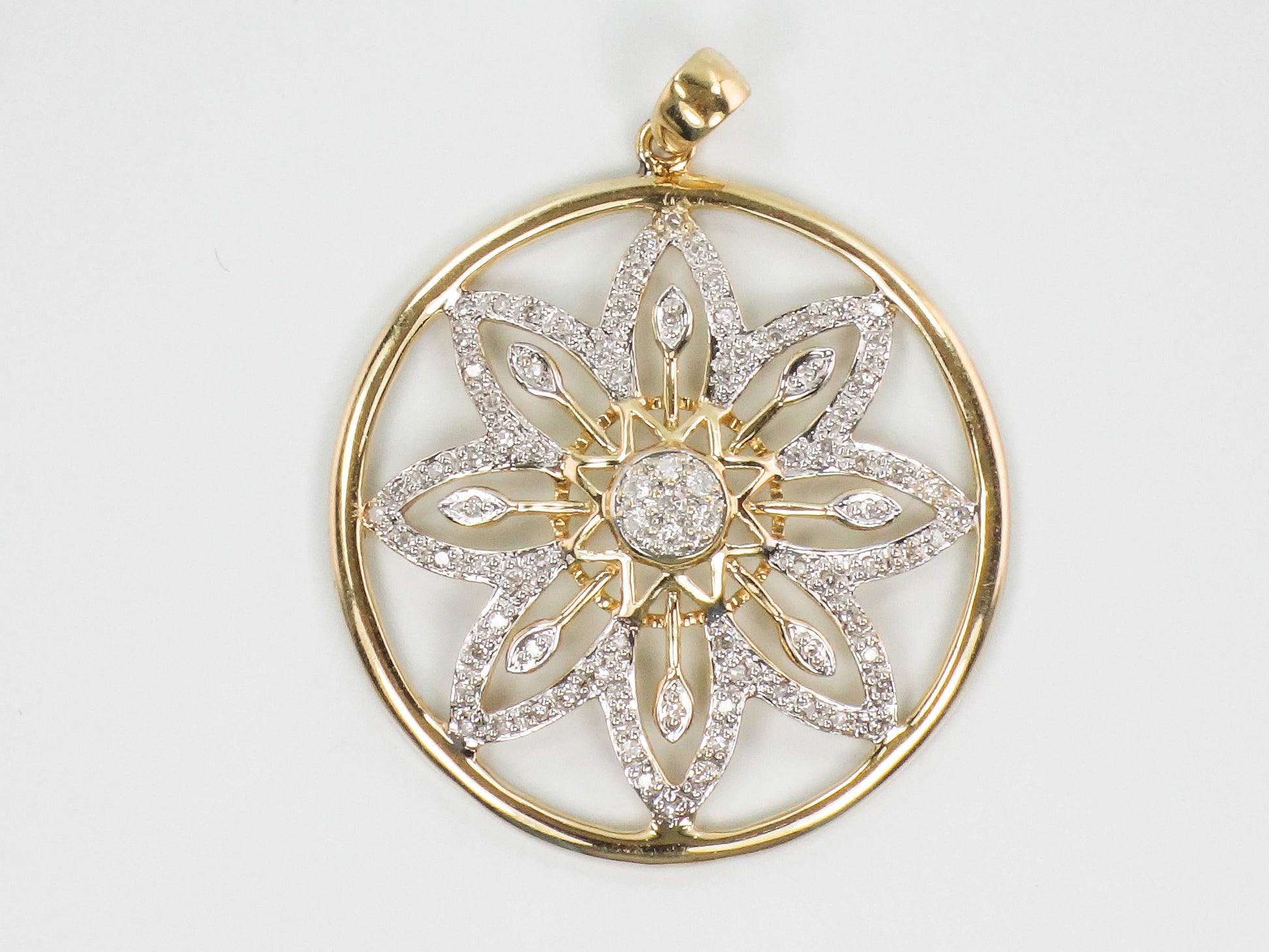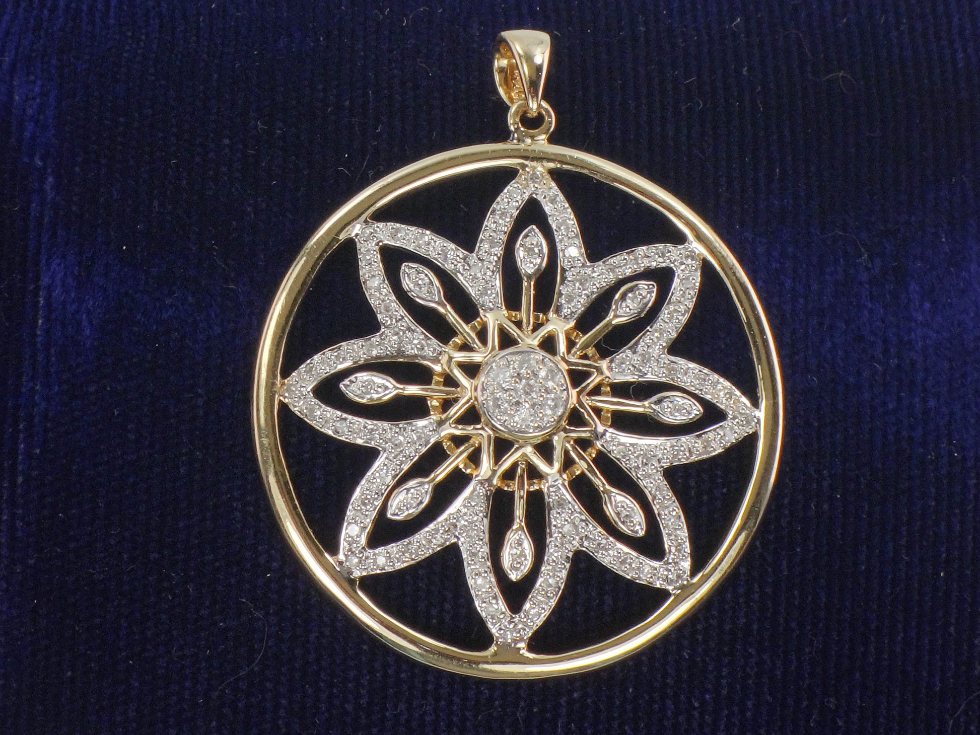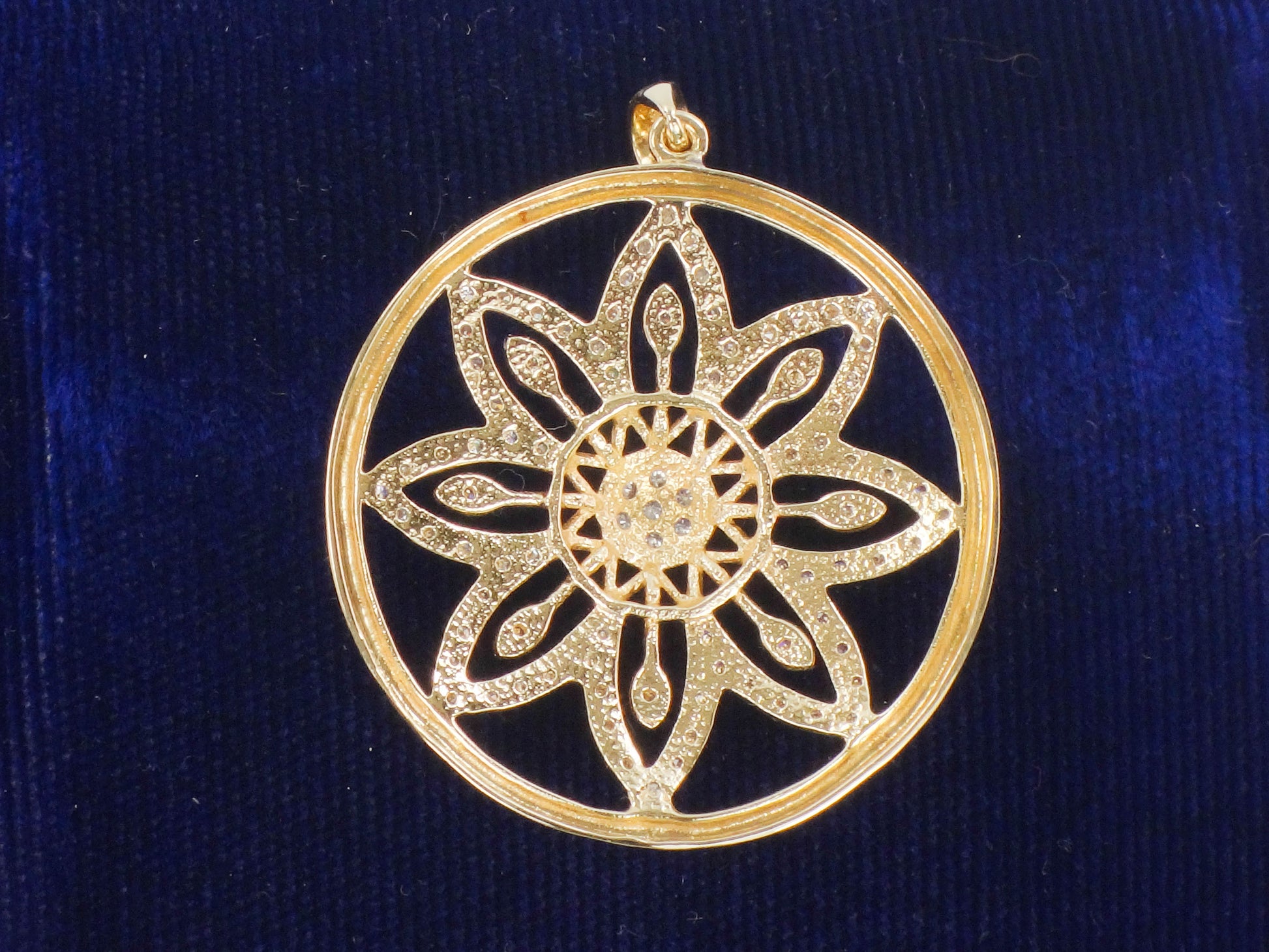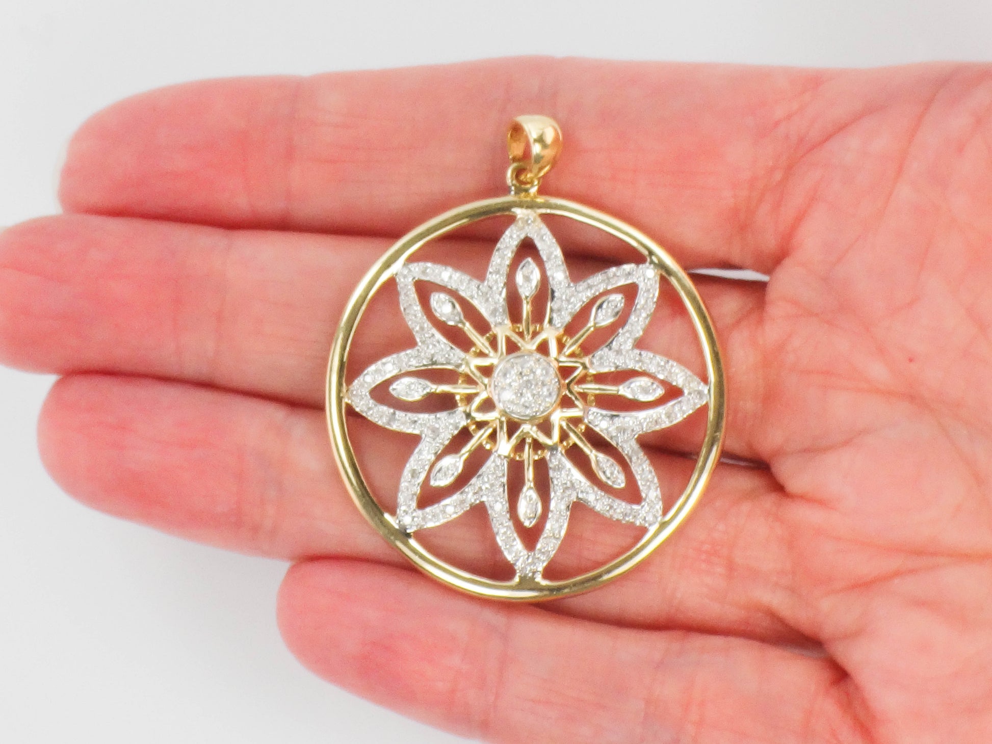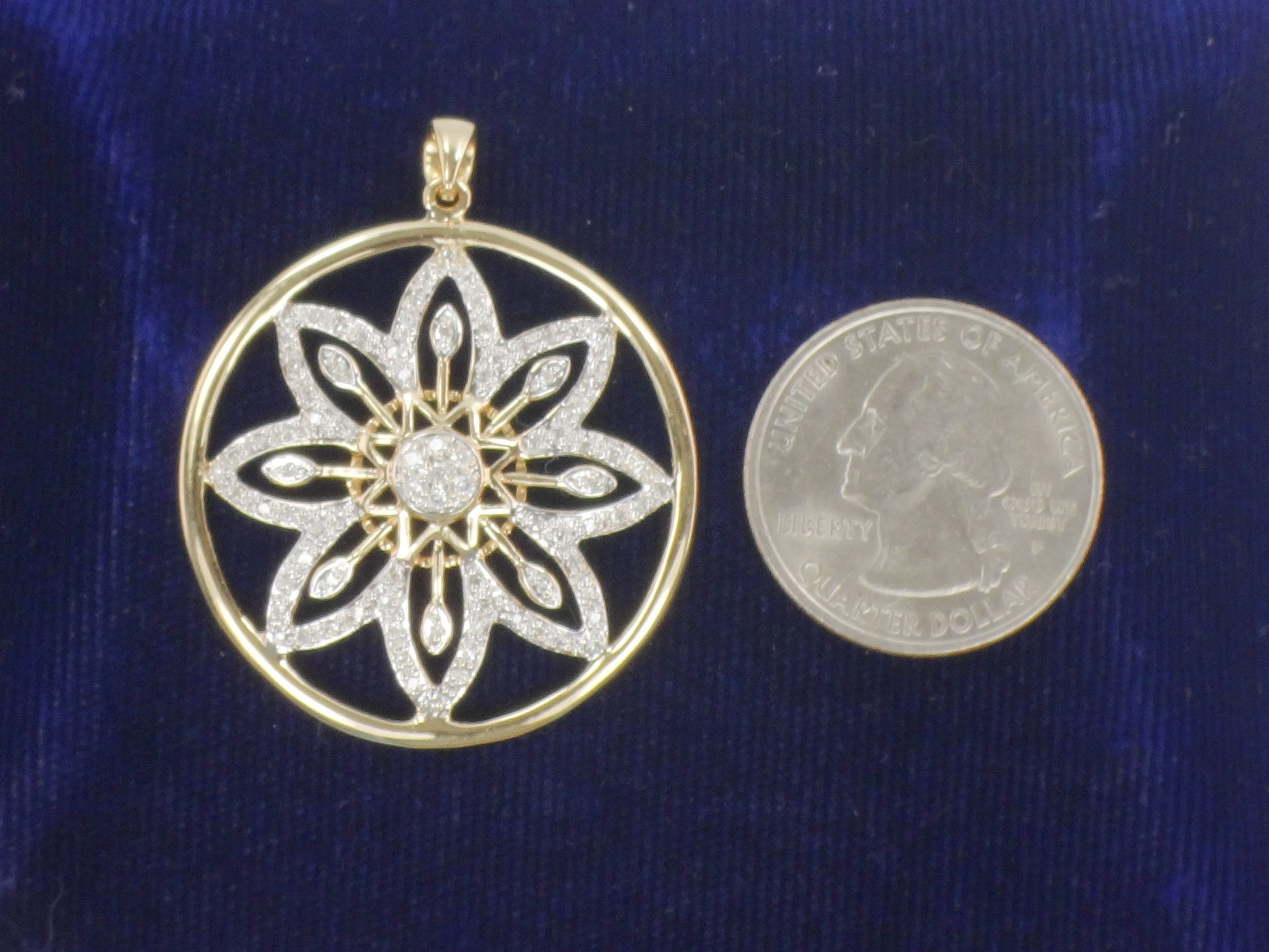 Vintage 14k Solid Gold Diamond Flower Pendant, Clyde Duneier Large Round Gold Pendant