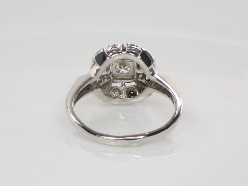 This Vintage 14k Gold Diamond Engagement Ring is a showstopper! The circa 1950's engagement ring features a beautiful cluster of round sparkling diamonds in a halo design. The center brilliant cut diamond weighs approximately .25 carats, H color and VS2-SI2 clarity. Surrounding the center diamond and set slightly below it are eight single cut diamonds weighing approximately .015 carats each. The diamonds, excluding the center diamond, are approximately H color, VS2-SI12 clarity. The total diamond weight is almost 1/3 carats. The setting is marked 14k and tests for solid 14k gold and shows evidence of a past sizing. The top of the ring measures approximately 11.6 mm in width and the ring has a rise of approximately 5.9 mm. The diamonds have romantic appeal and sparkle in the light. The effect is quite breathtaking. This beautiful ring is in good vintage condition and is ready to be worn and enjoyed. The sparkling diamonds and vintage halo style setting are lovely!