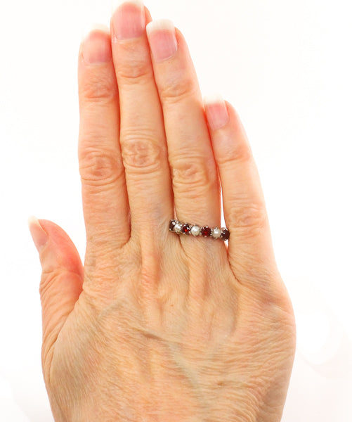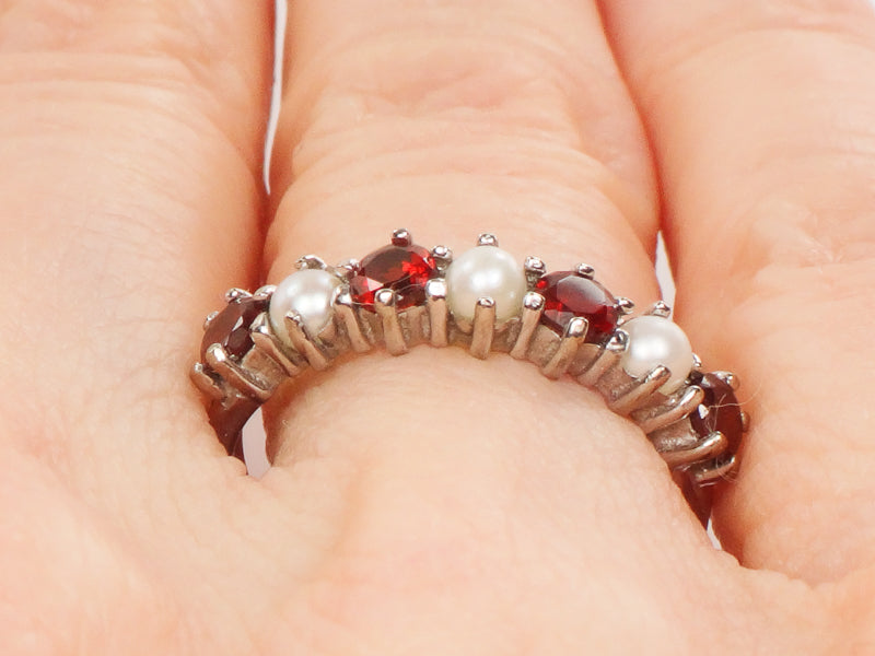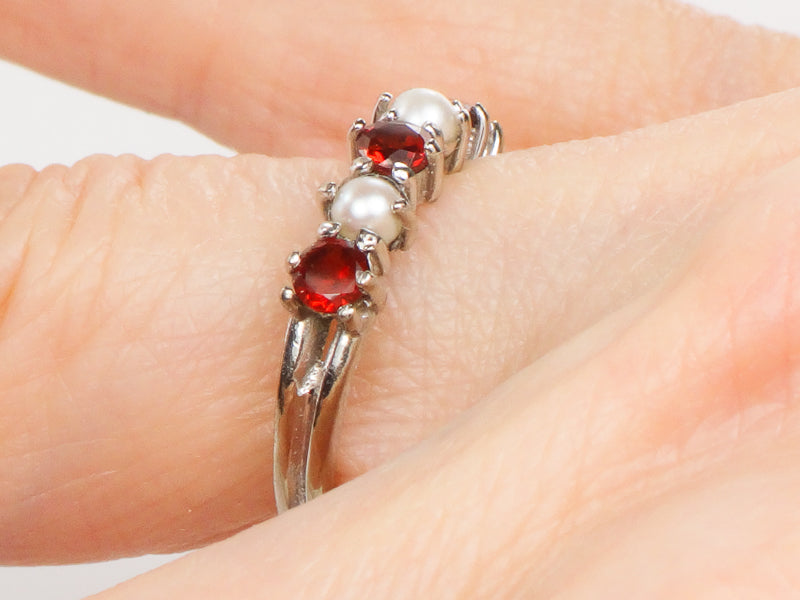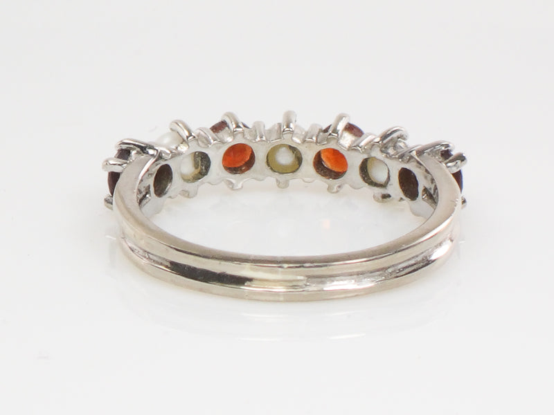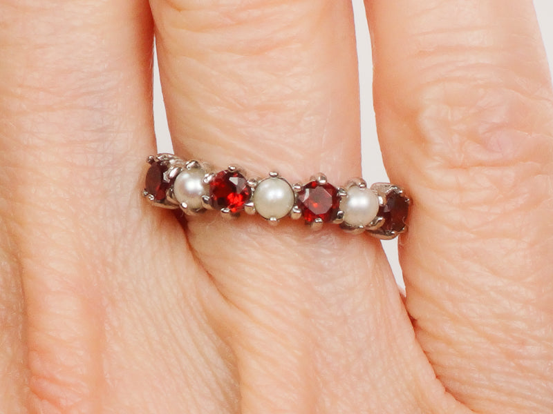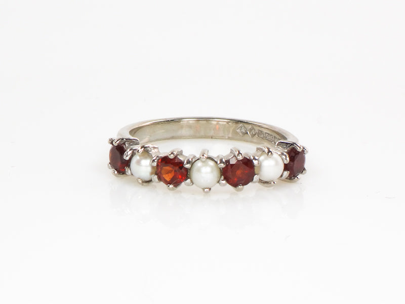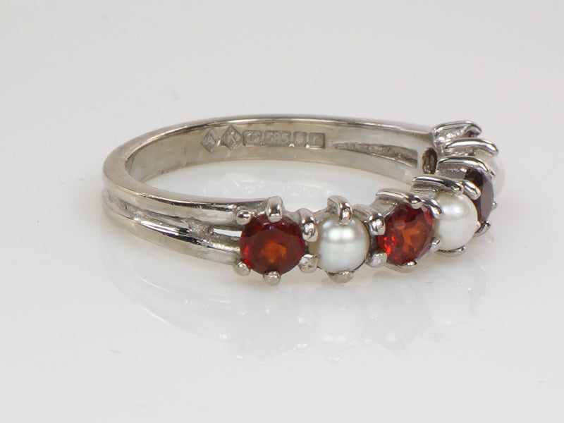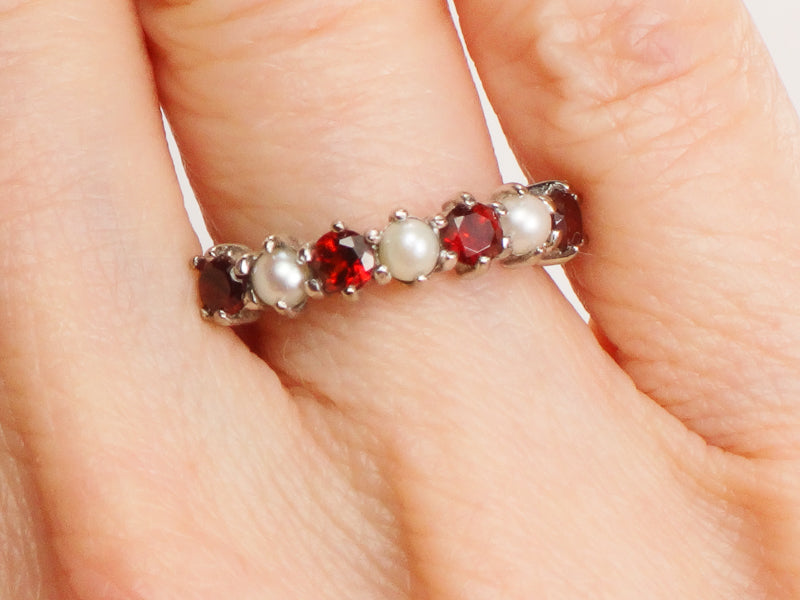 Vintage 14k White Gold Garnet and Pearl Ring with English Hallmarks, Wedding Band, Stacking Ring