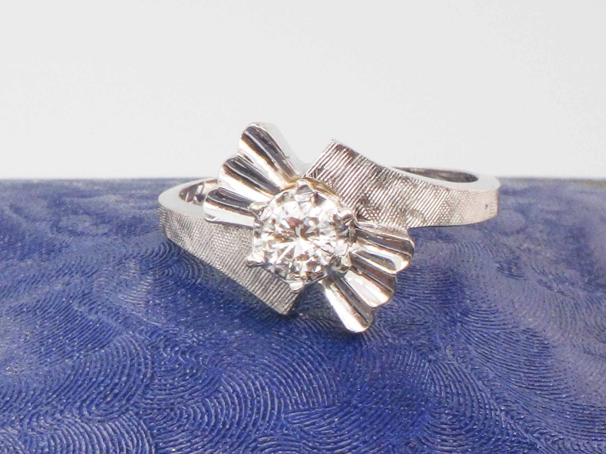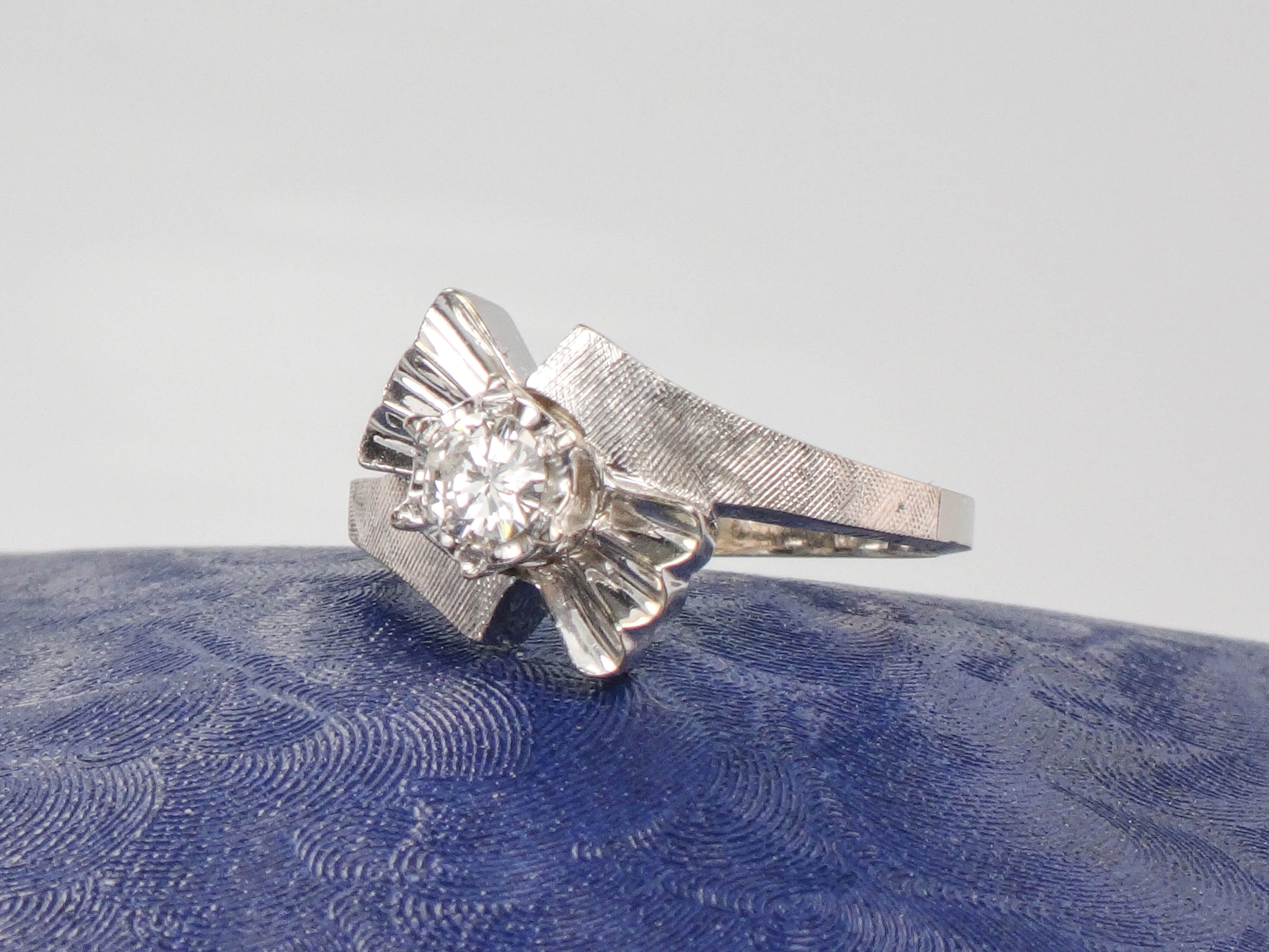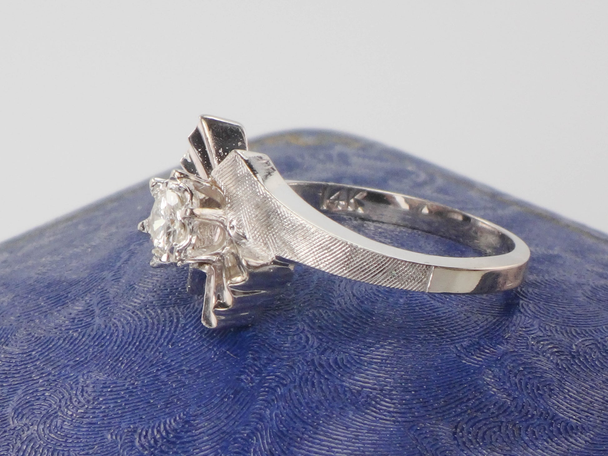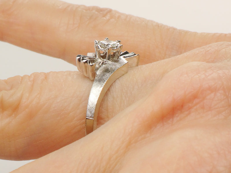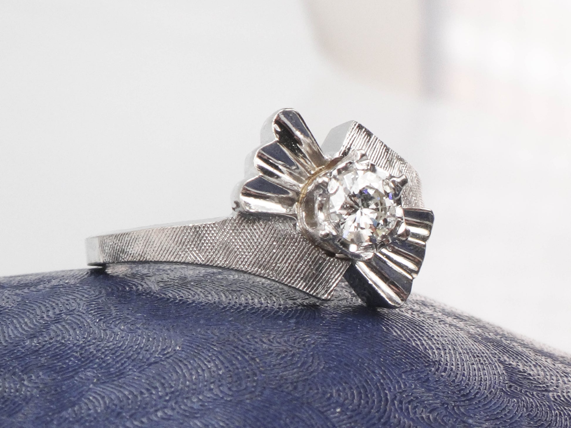 This Vintage 14k Gold Diamond Engagement Ring is magnificent! The engagement ring features a brilliant cut round natural diamond weighing approximately .25 carats, approximately H color and SI2 clarity. The setting has mid-century style and is 14k white gold (marked 14k on the inside and tested to be solid 14k gold). The rise of the ring is approximately 5.6 mm. This diamond is an eye catcher! It picks up the light and sparkles! This beautiful ring is in good vintage condition and is ready to be worn and enjoyed!