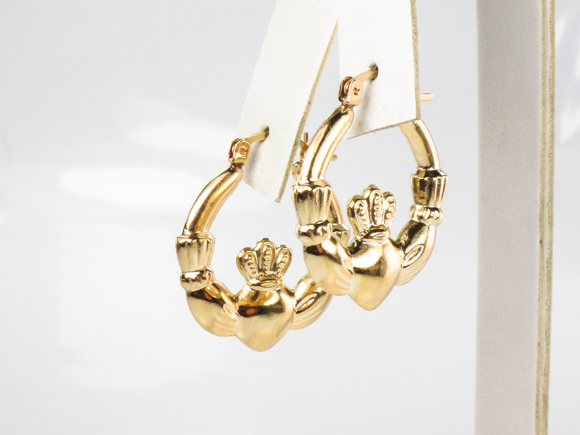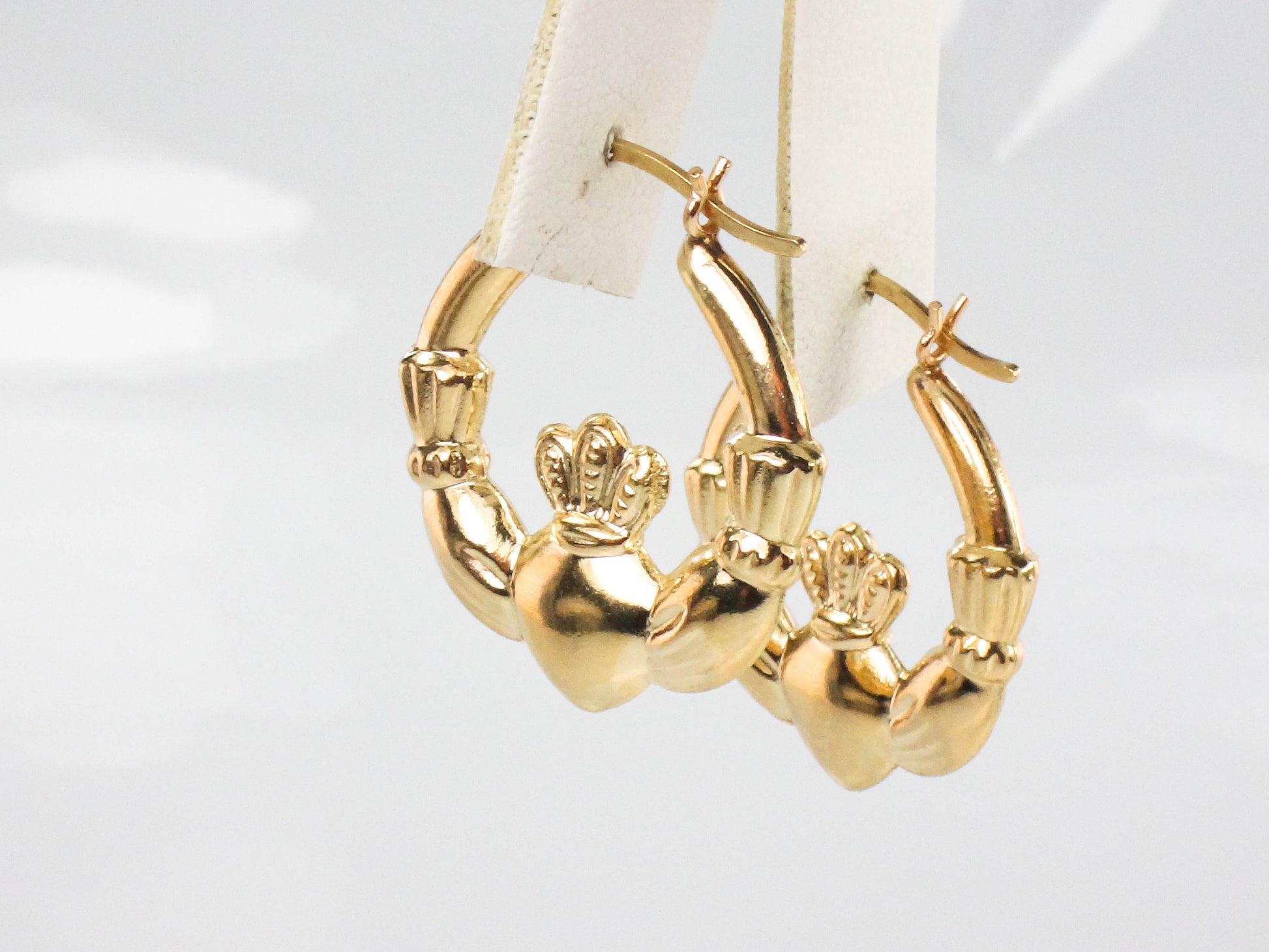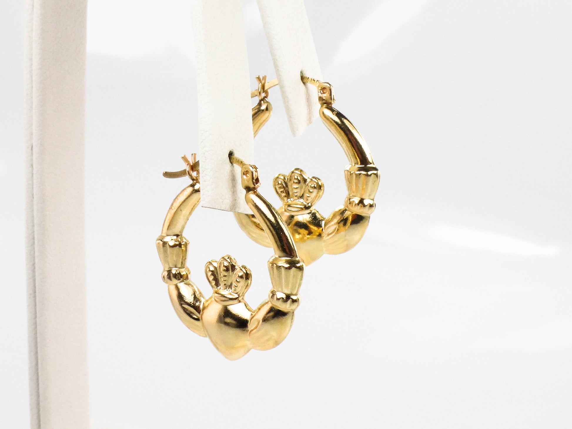 Vintage 14k Yellow Gold Claddagh Hoop Earrings, Irish Symbol Earrings