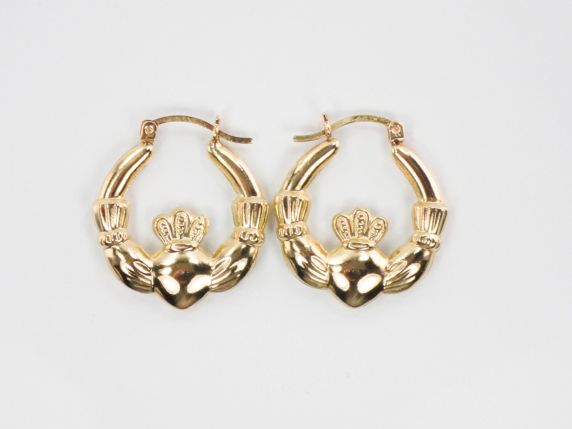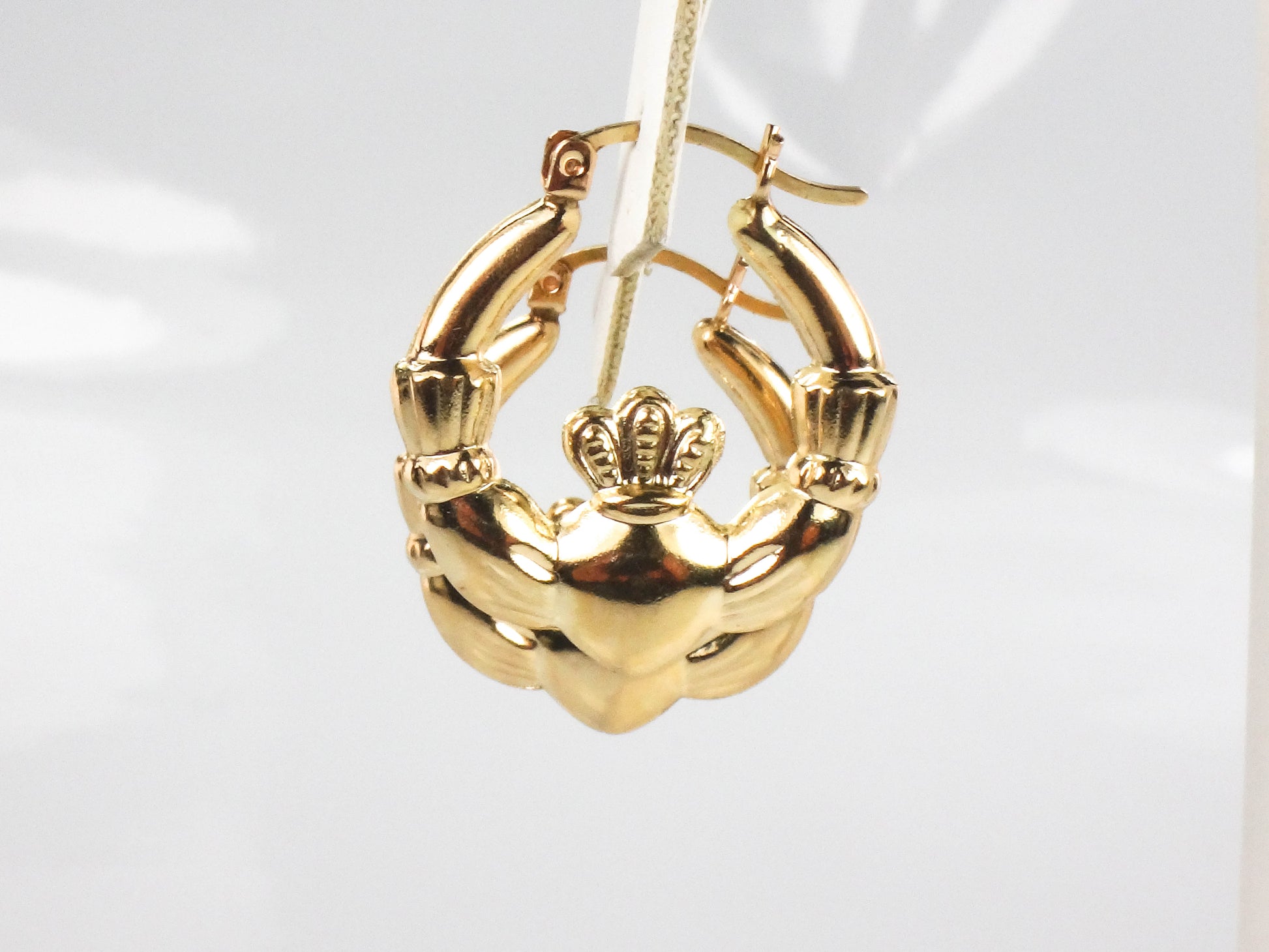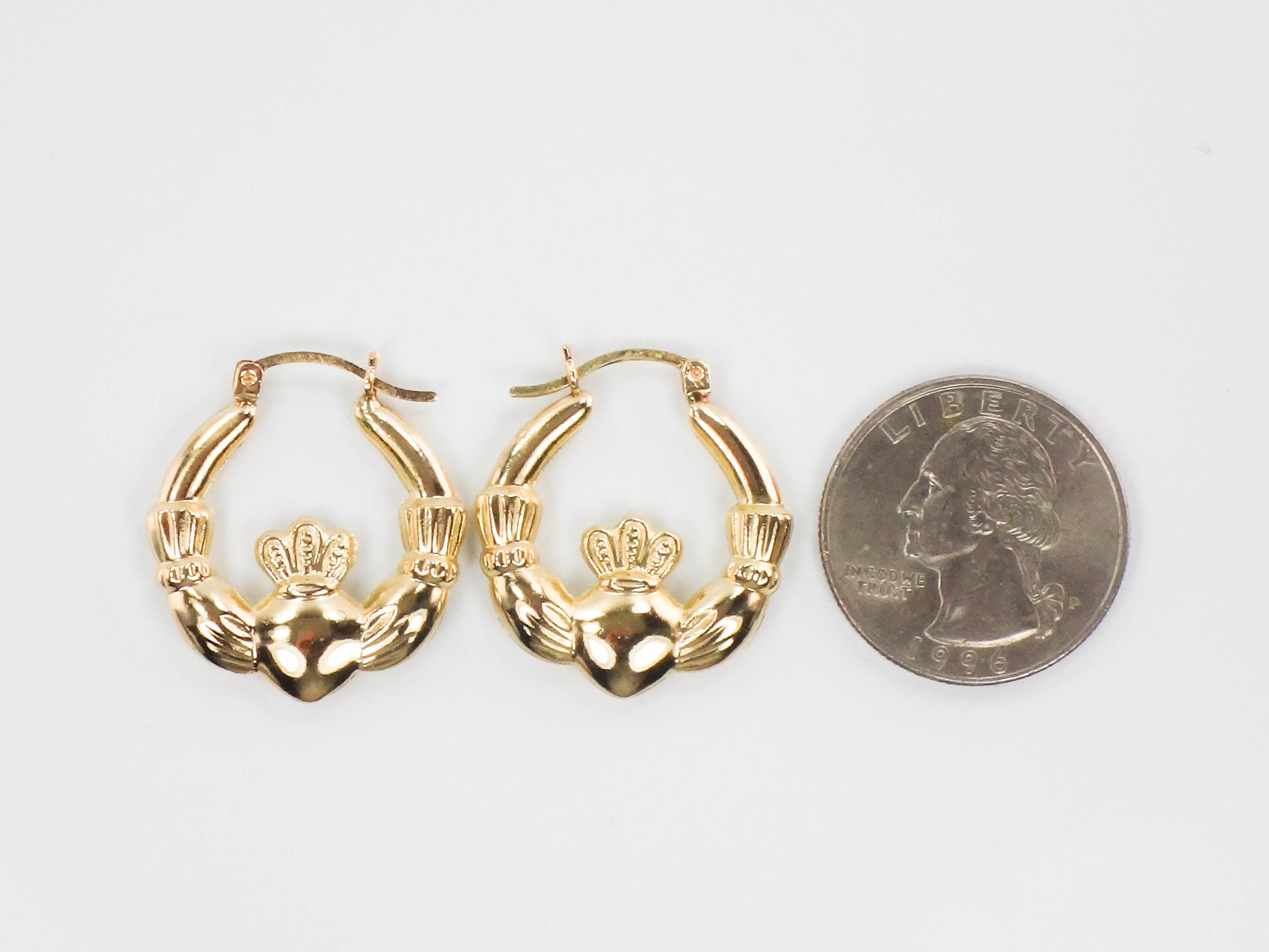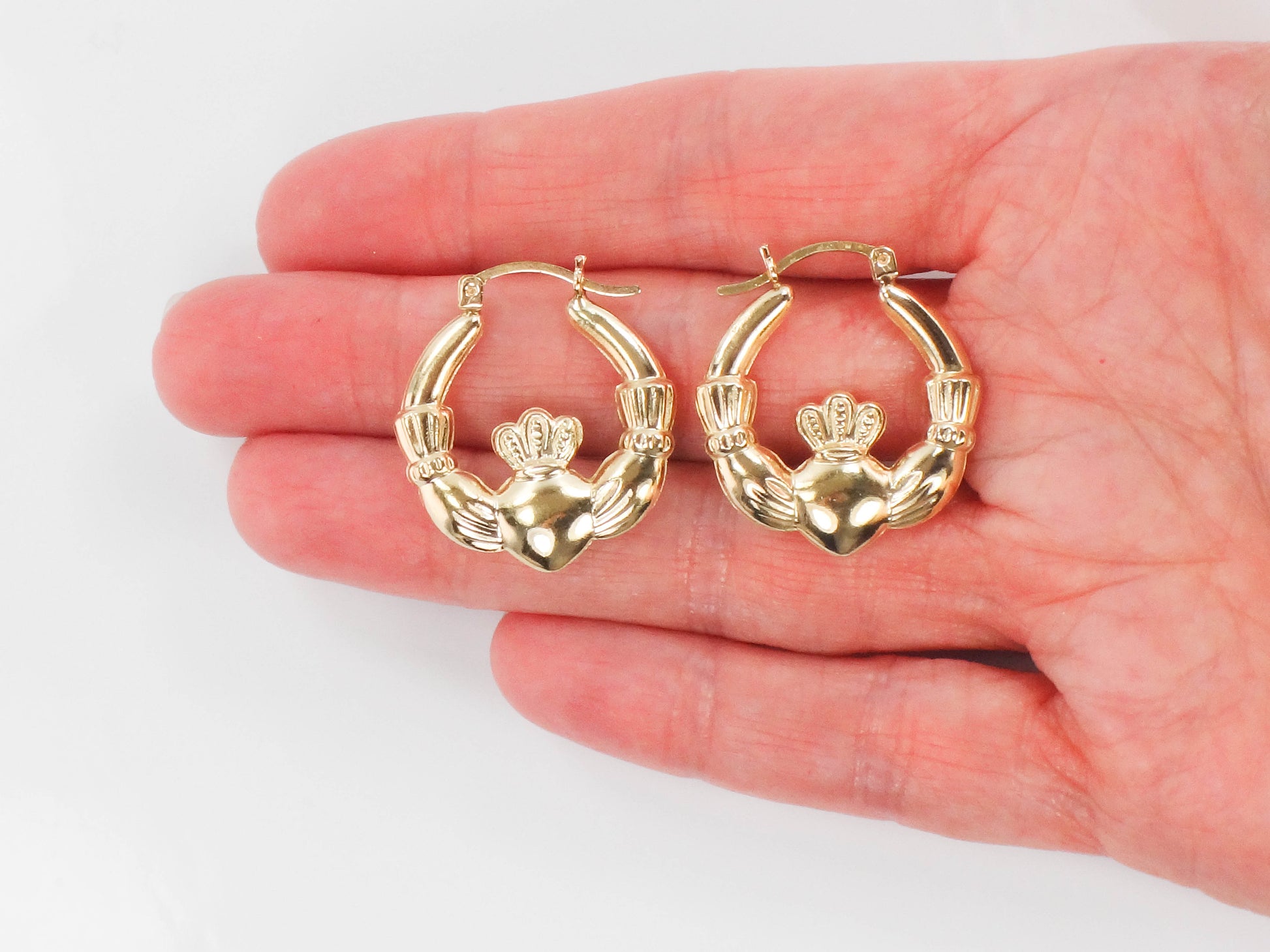 Vintage 14k Yellow Gold Claddagh Hoop Earrings, Irish Symbol Earrings