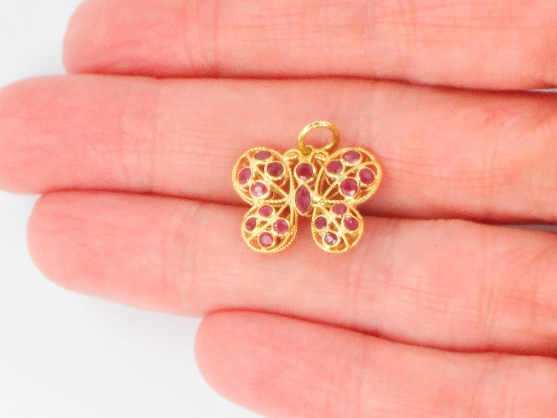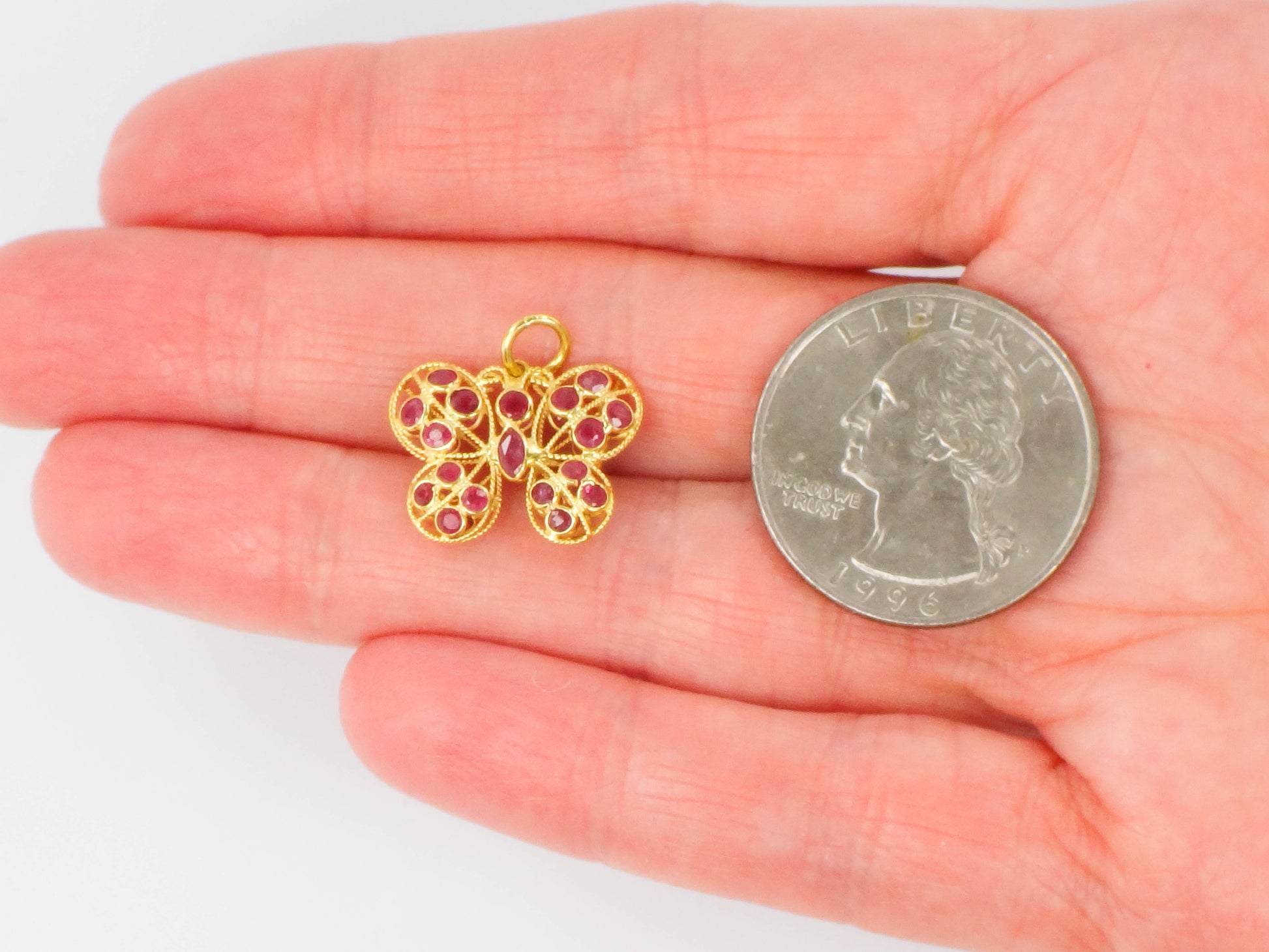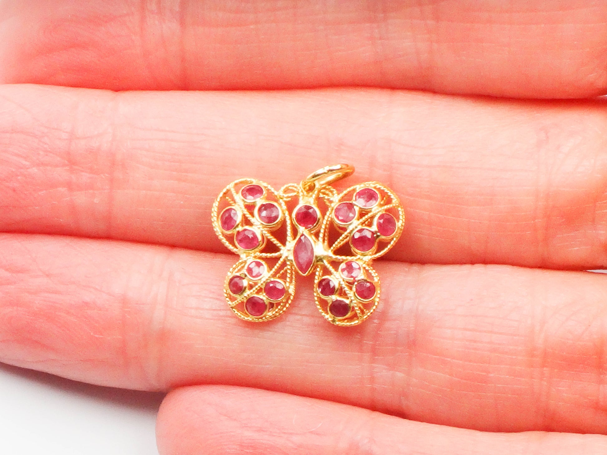 Vintage 18k Yellow Gold Natural Ruby Butterfly Pendant Charm, July Birthstone Gift