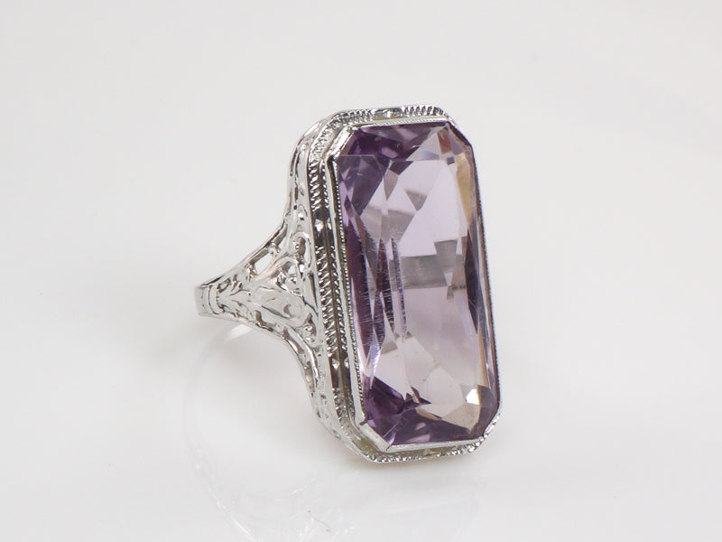 Vintage Art Deco Style 14k White Gold Rectangle Cut Amethyst Filigree Ring