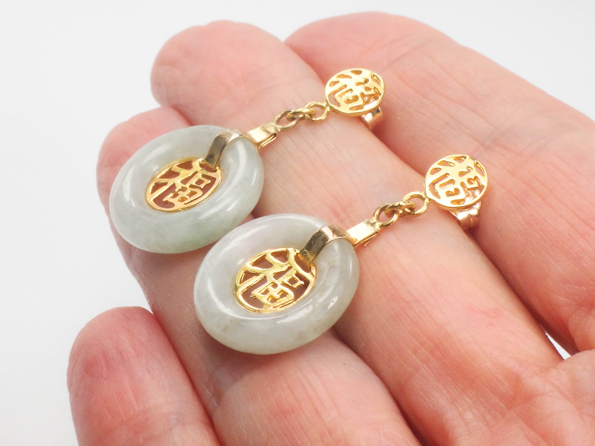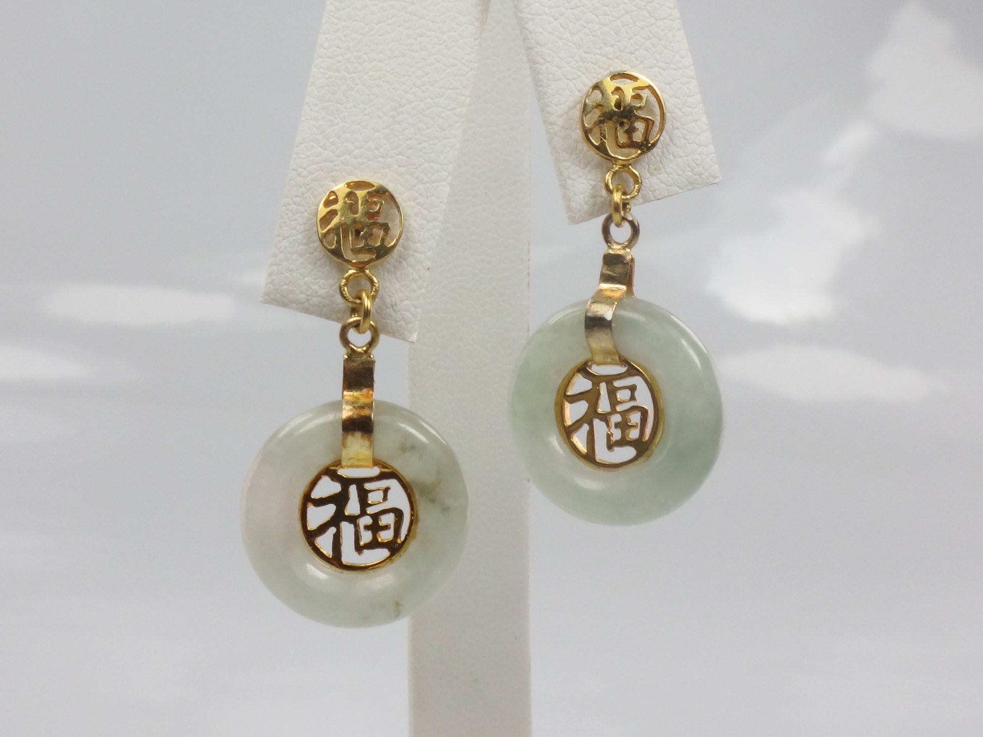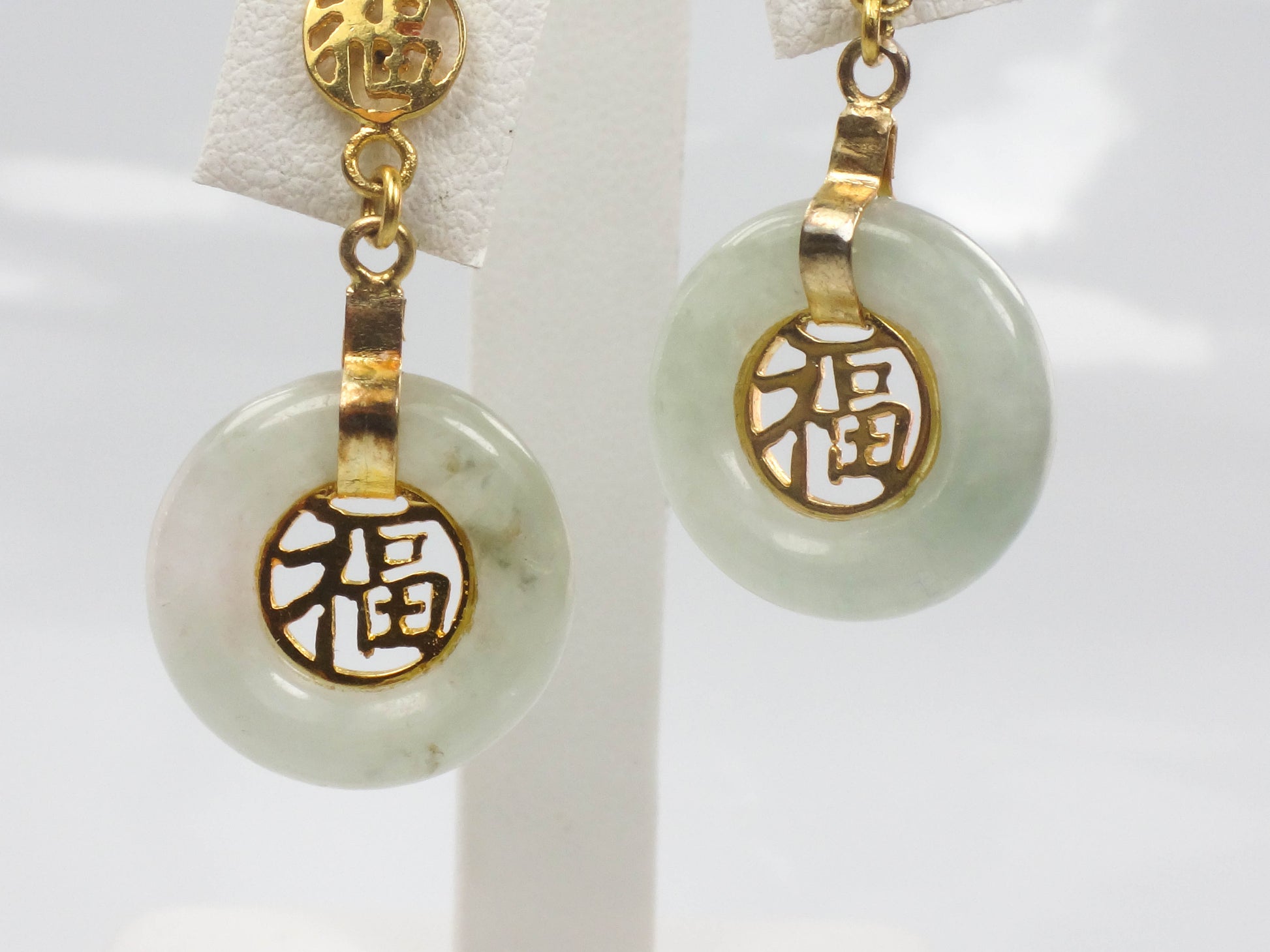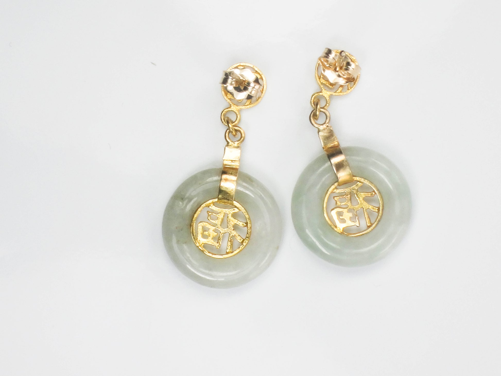 These Vintage Gold Plated Silver Jade Earrings are timeless! The earrings are gold over sterling silver and each showcases a round natural green jade stone with a gold tone Chinese symbol at the center. The jade has medium light green color. The disc of jade has a gold tone strap and another small Chinese symbol sits at the top of the earring. The earrings have post backs. The earrings are unmarked and are gold plated silver. These lovely earrings have classic style, beautiful color and are said to bring good luck. They are in good vintage condition and are ready to be worn and enjoyed!