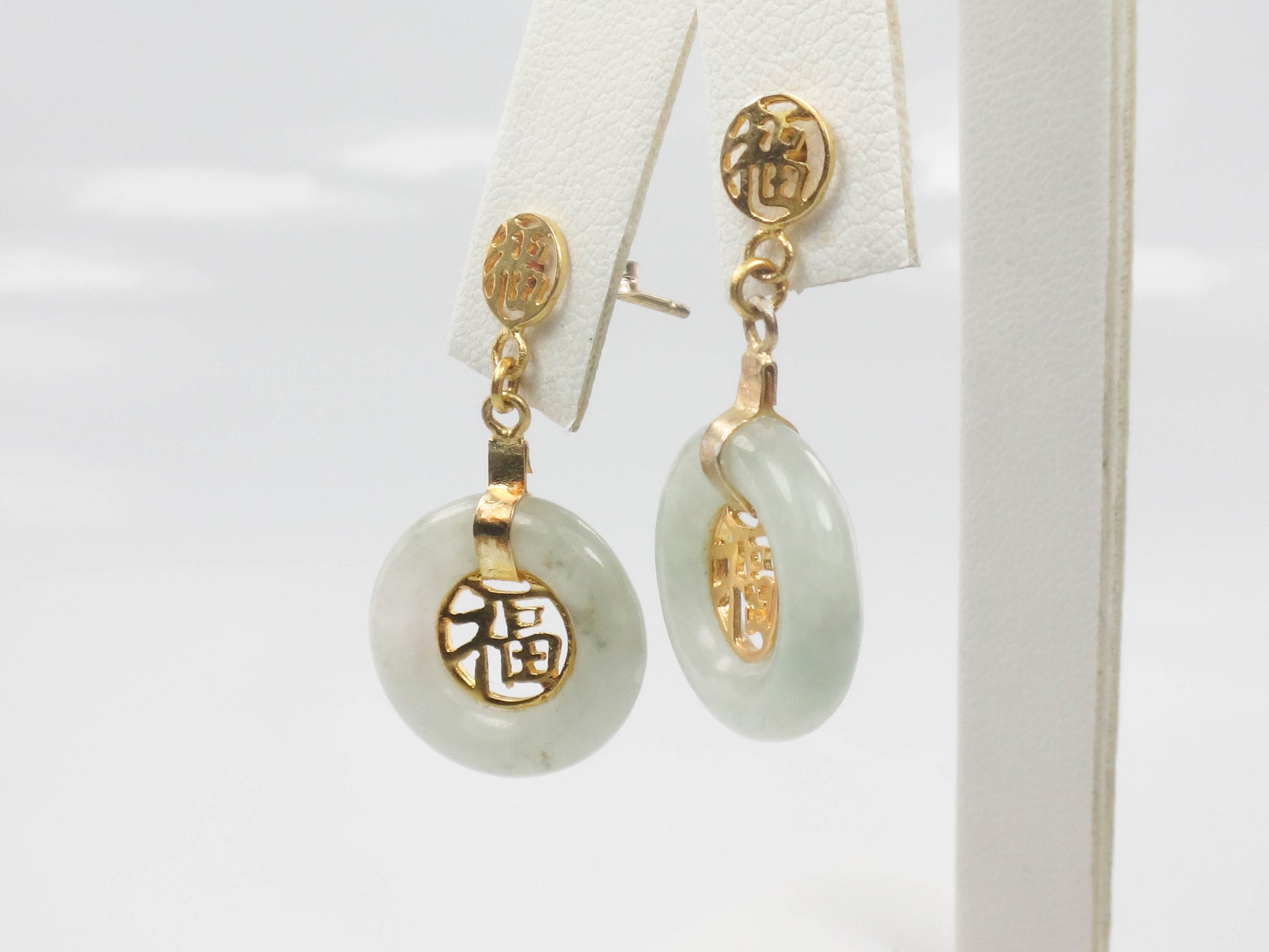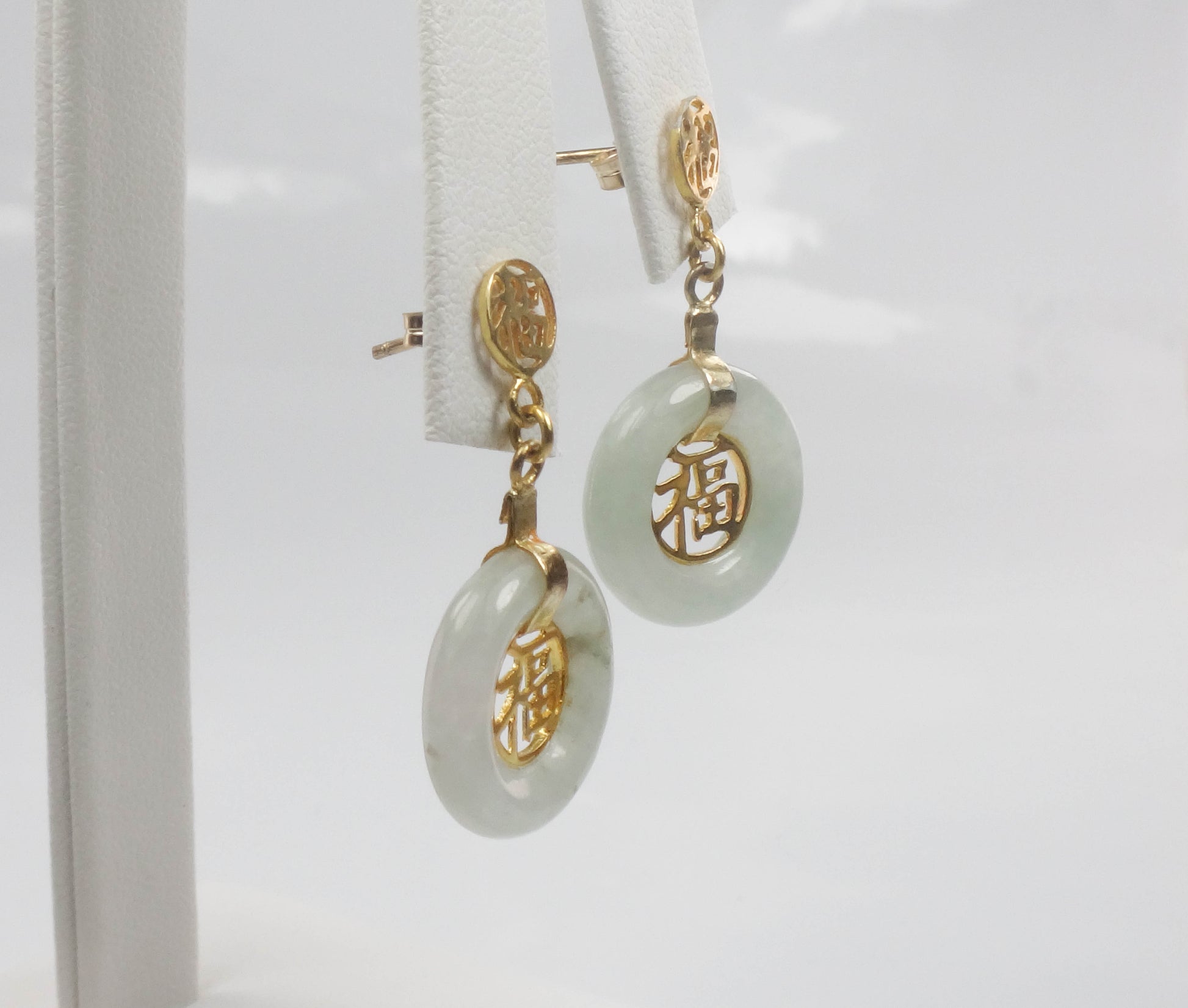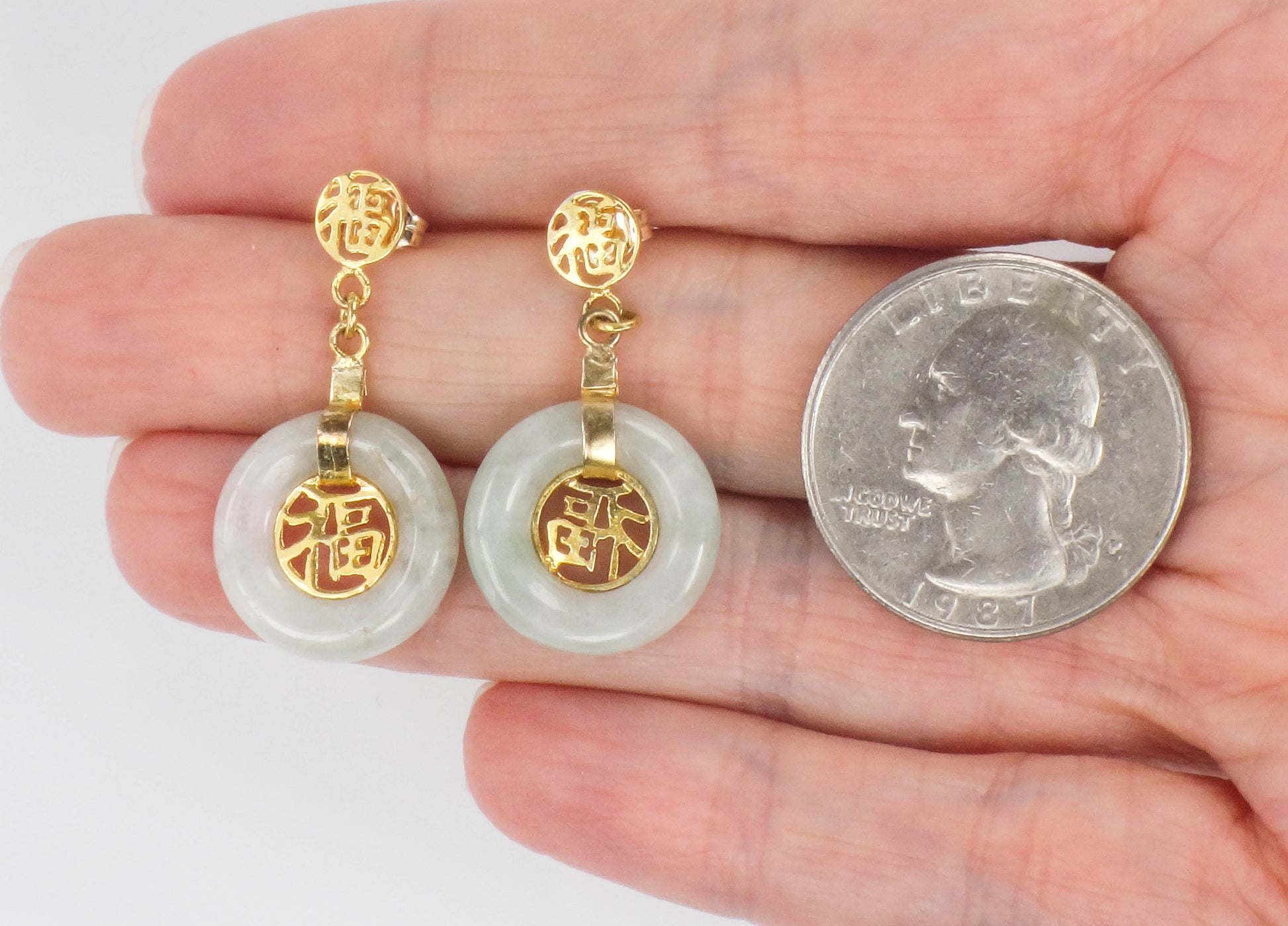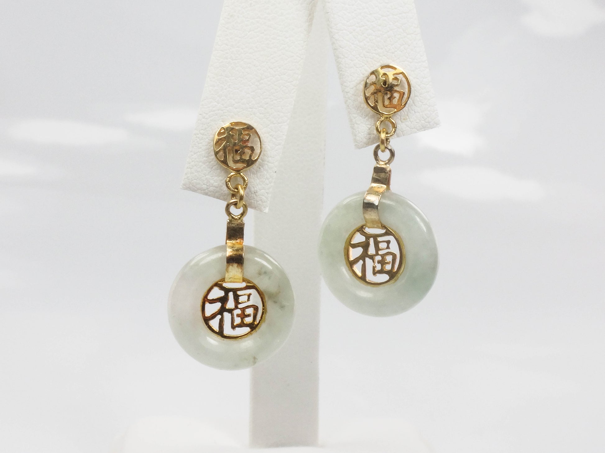 These Vintage Gold Plated Silver Jade Earrings are timeless! The earrings are gold over sterling silver and each showcases a round natural green jade stone with a gold tone Chinese symbol at the center. The jade has medium light green color. The disc of jade has a gold tone strap and another small Chinese symbol sits at the top of the earring. The earrings have post backs. The earrings are unmarked and are gold plated silver. These lovely earrings have classic style, beautiful color and are said to bring good luck. They are in good vintage condition and are ready to be worn and enjoyed!