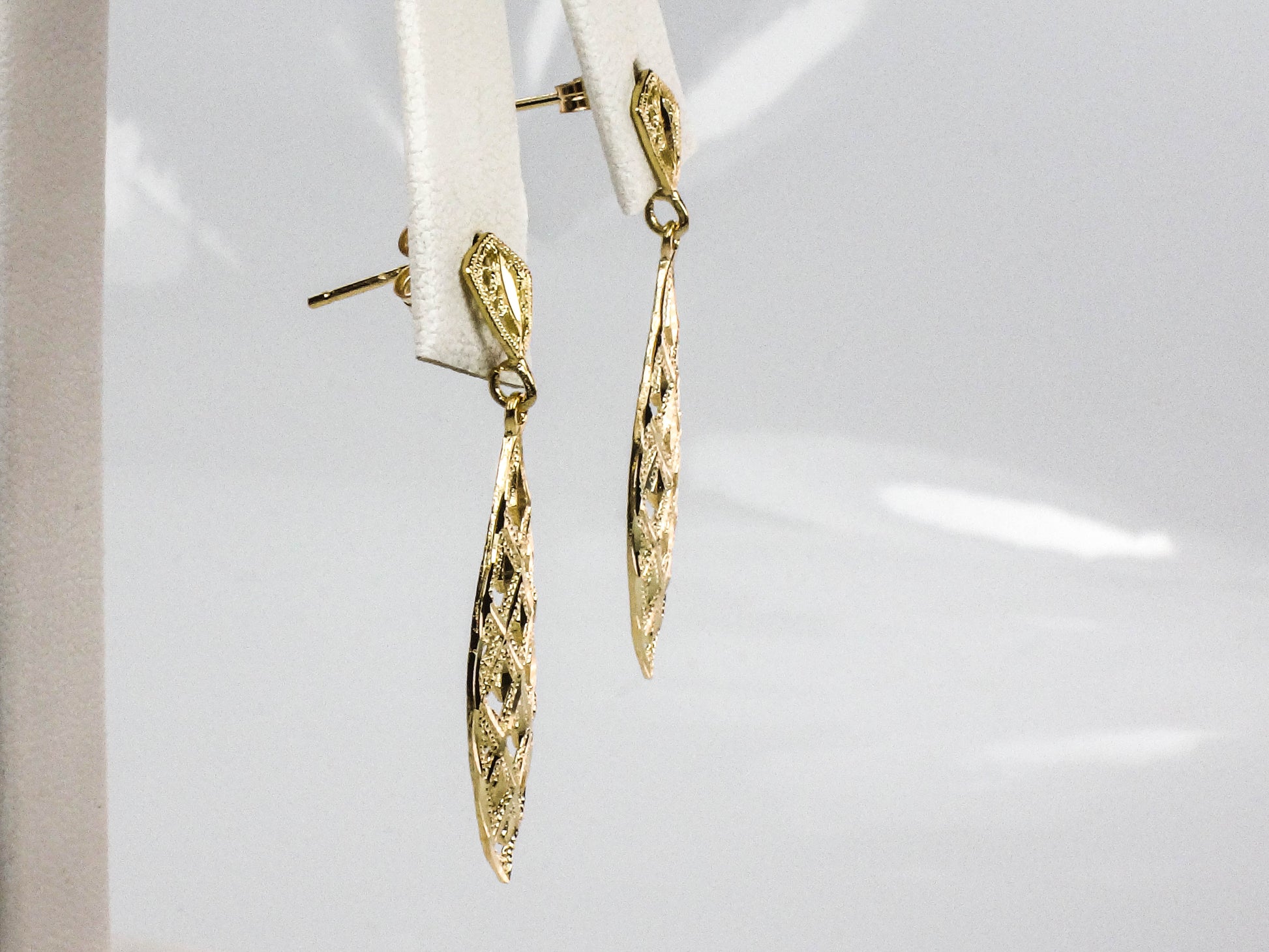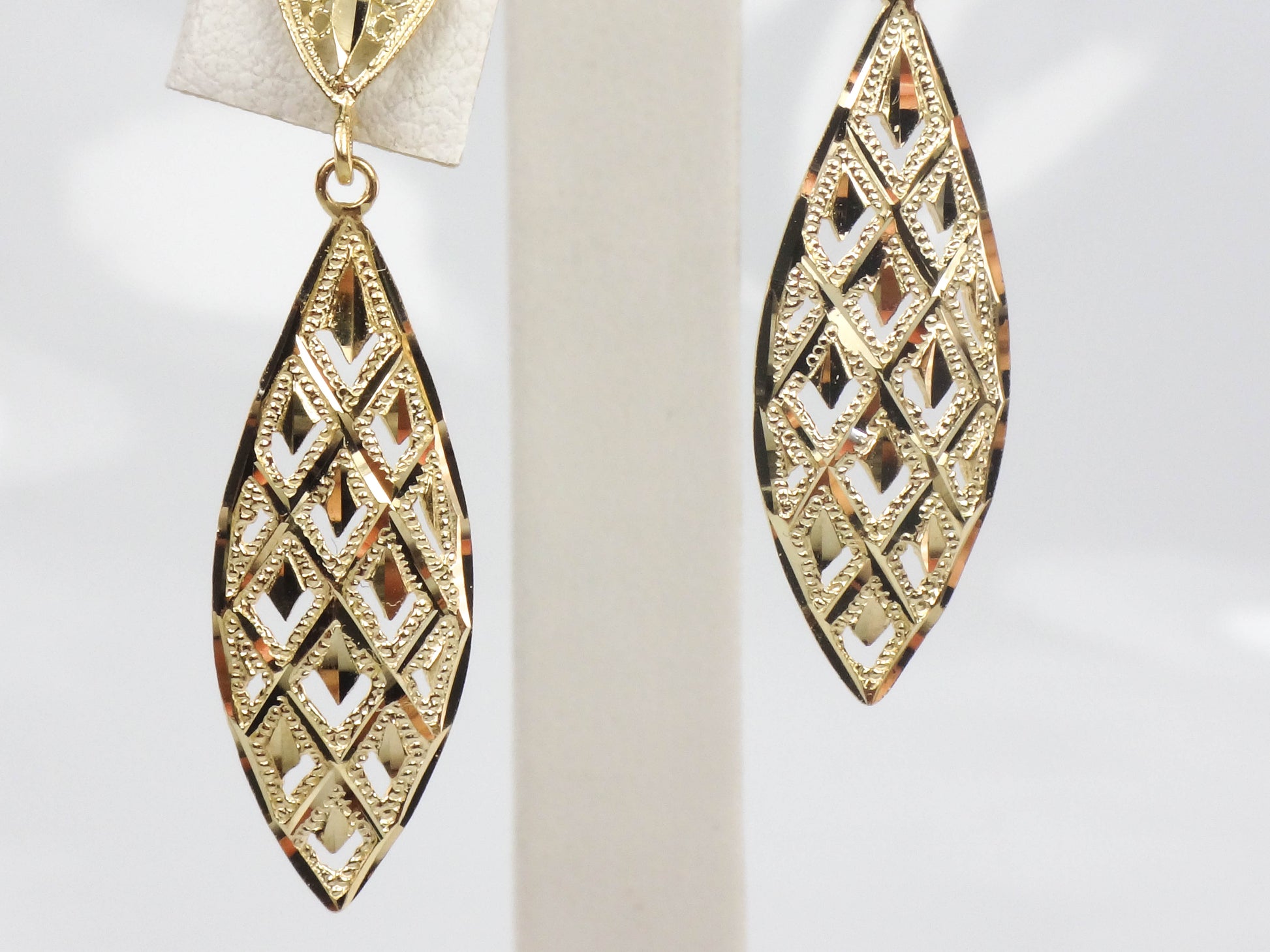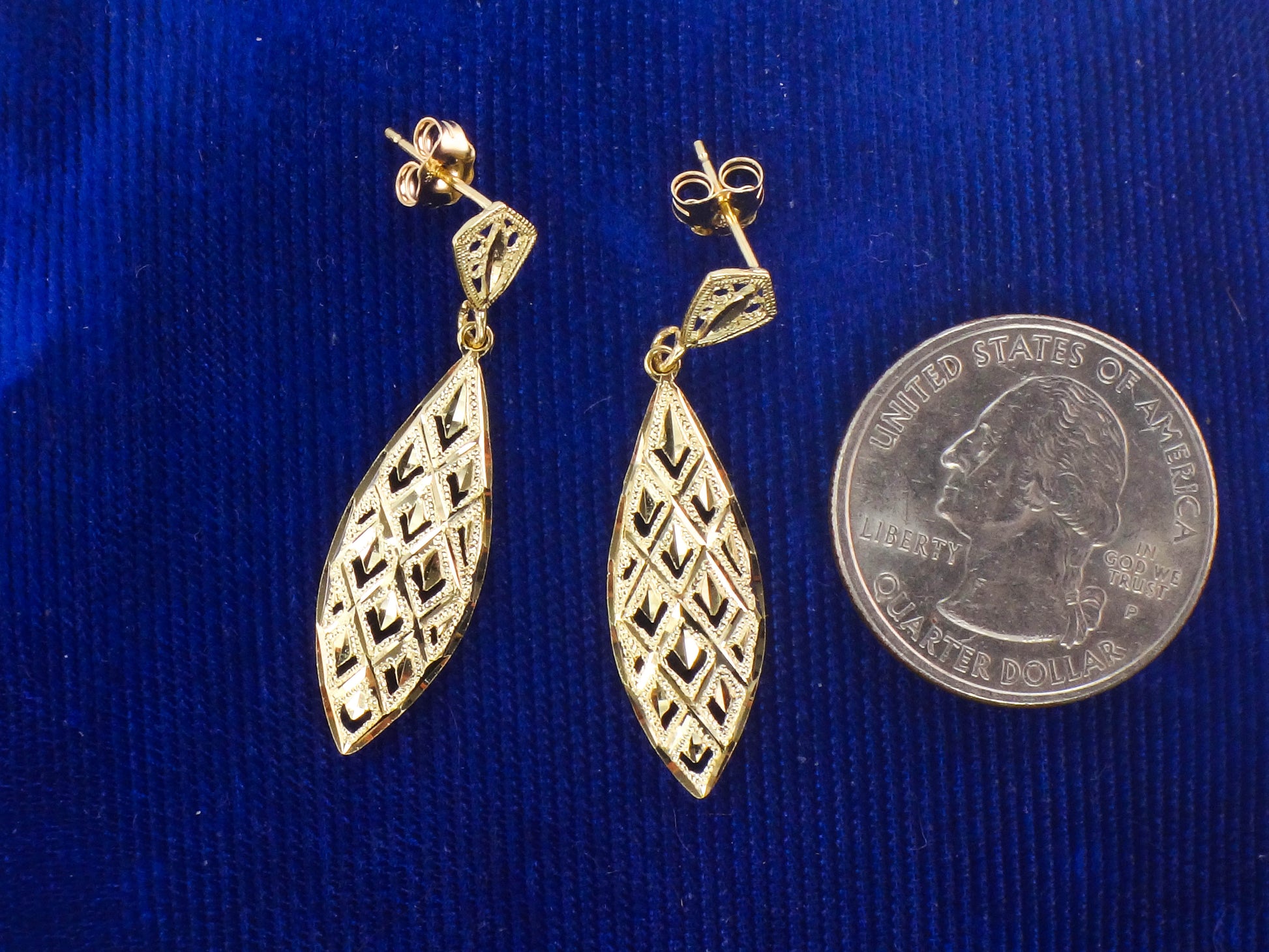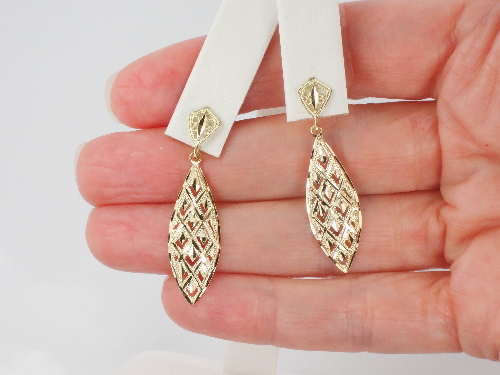 These vintage solid 14k yellow gold dangle earrings showcase diamond-cut detailing with a pierced cut out design that captures light with remarkable brilliance. Their elegant silhouette offers a refined statement that elevates both formal attire and everyday ensembles. The classic design promises enduring sophistication for the discerning collector. The earrings are marked 14k and test for 14k gold (not plated or filled) and the push on backs are also 14k gold.