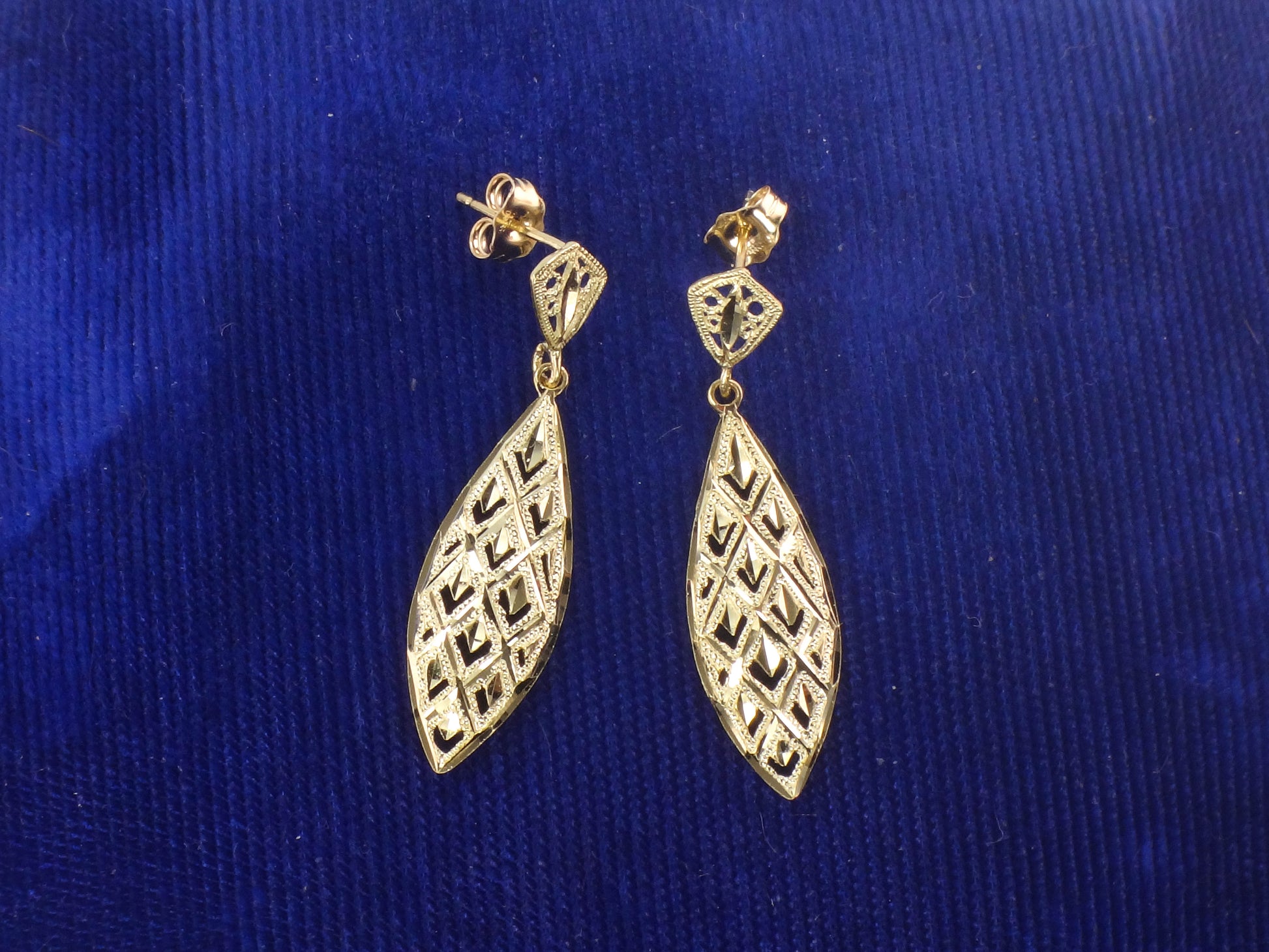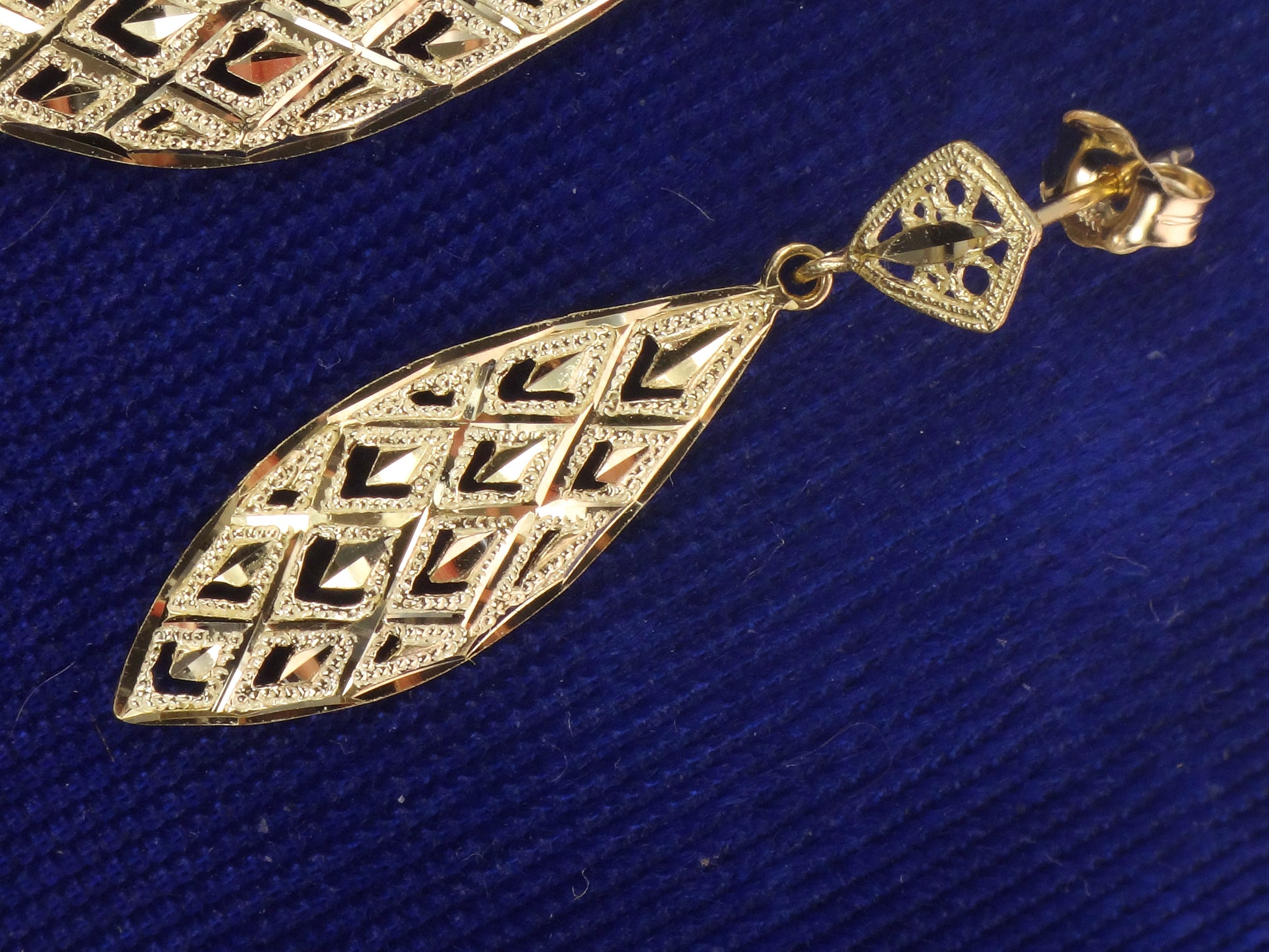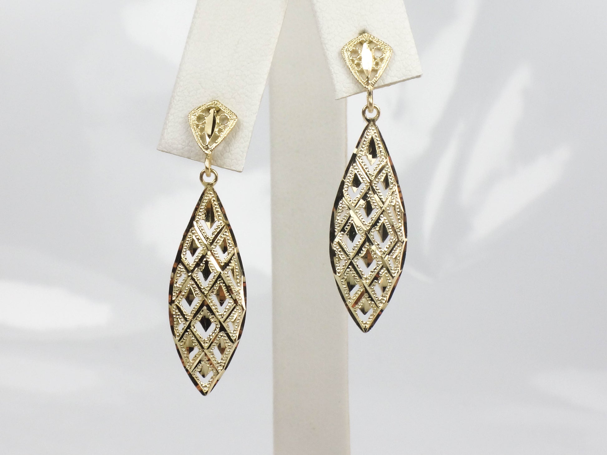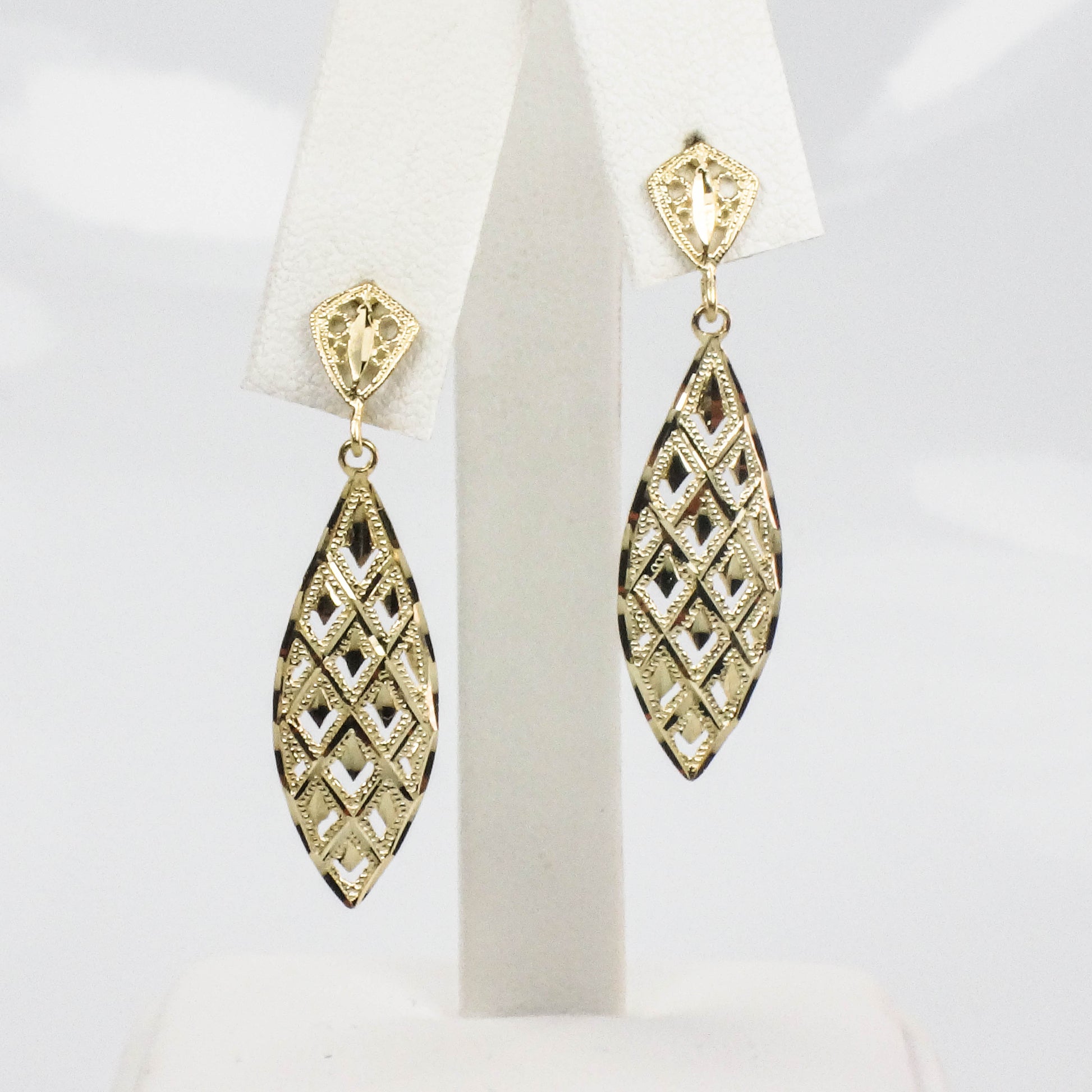 These vintage solid 14k yellow gold dangle earrings showcase diamond-cut detailing with a pierced cut out design that captures light with remarkable brilliance. Their elegant silhouette offers a refined statement that elevates both formal attire and everyday ensembles. The classic design promises enduring sophistication for the discerning collector. The earrings are marked 14k and test for 14k gold (not plated or filled) and the push on backs are also 14k gold.