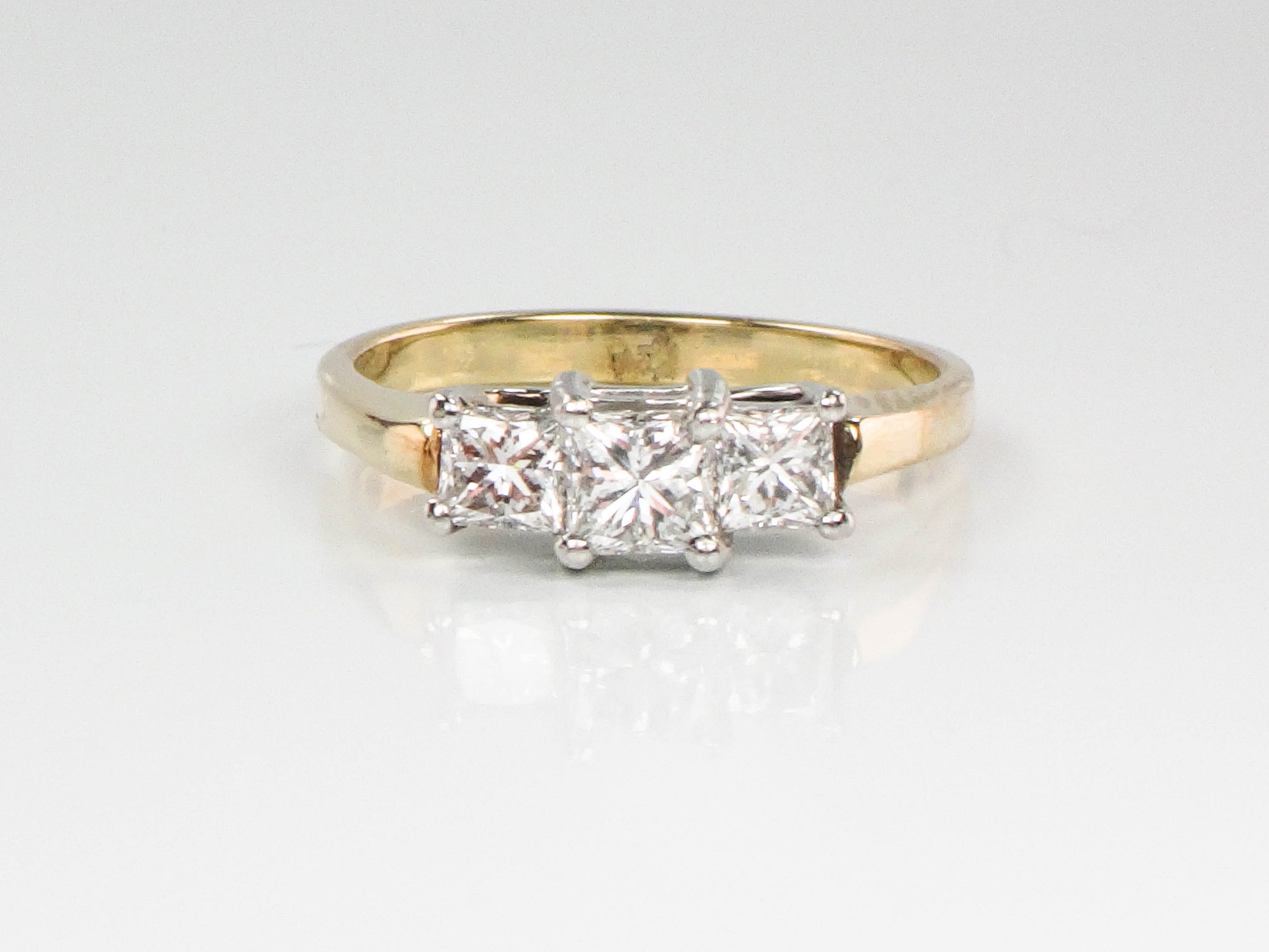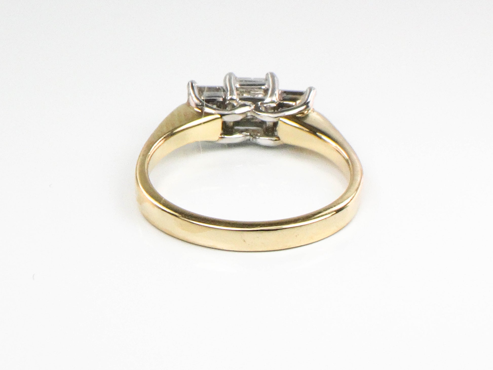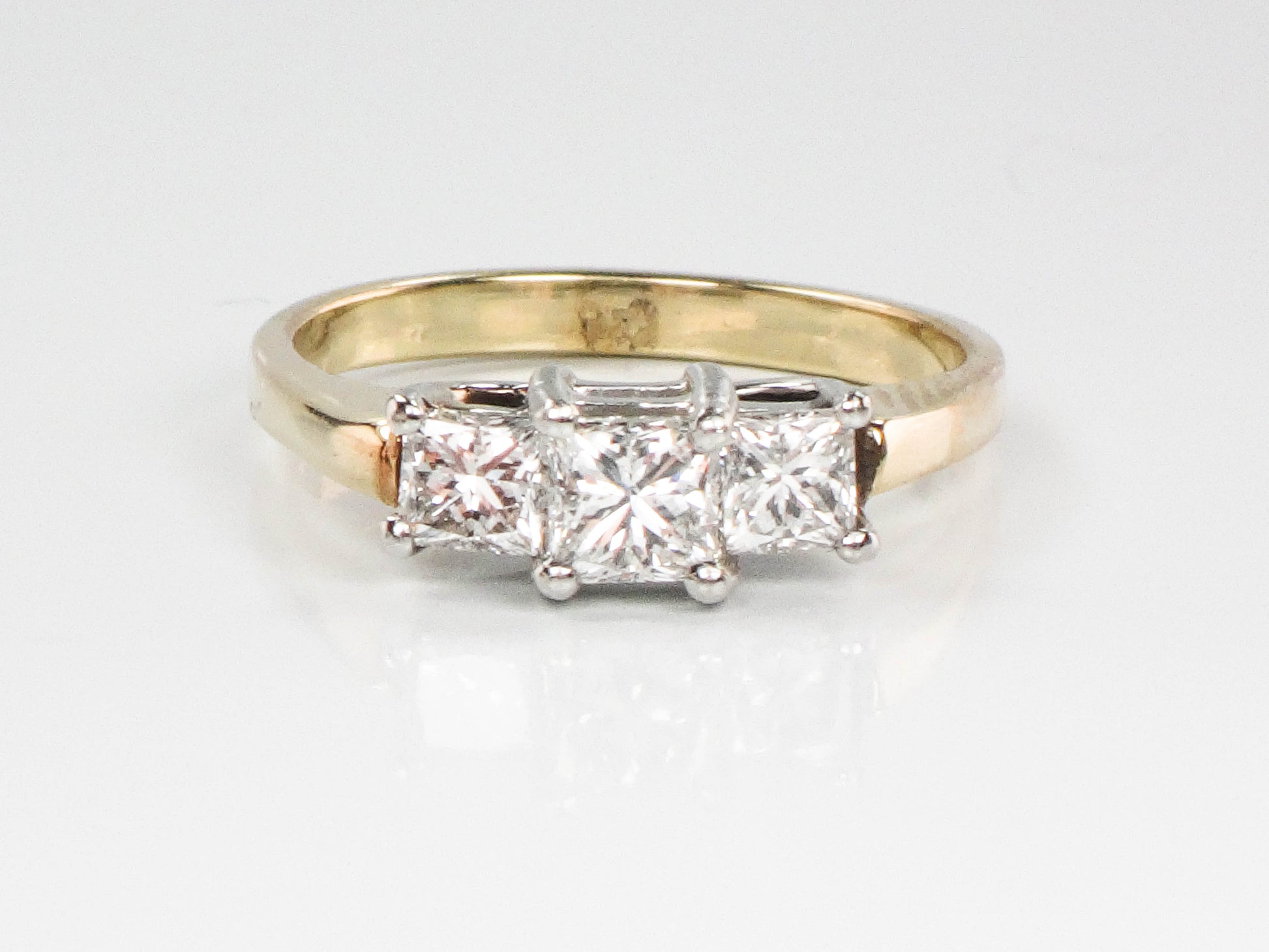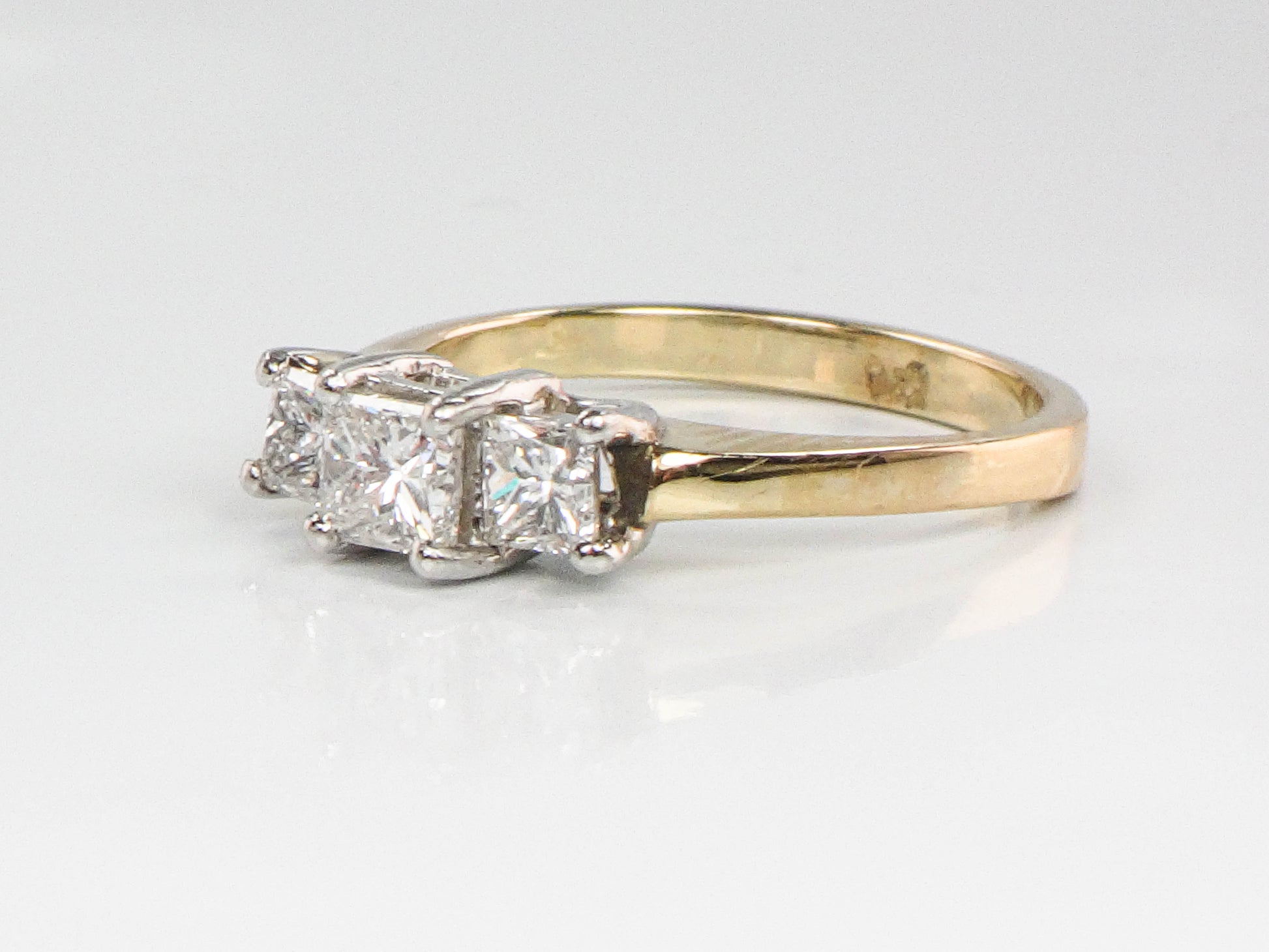 This Vintage Three Stone Diamond Engagement Ring is beautiful! It features three square, also known as princess cut, diamonds in a simple and elegant design. The ring dates to approximately 2000. The center diamond weighs approximately .40 carats, H-I color, I1 clarity and .20 carats on each side, H-I color, SI1-SI2 clarity. There is approximately .80 carats of diamonds in total. The top of the ring is white gold where the diamonds are set and the band is yellow gold. The ring is unmarked and tests for 14k gold (not plated or filled). The rise of the ring is approximately 5.8 mm. This ring is very elegant with classic style. The diamonds sparkle! This ring could be worn as an engagement ring, promise ring, anniversary ring or right hand ring. It is very lovely!