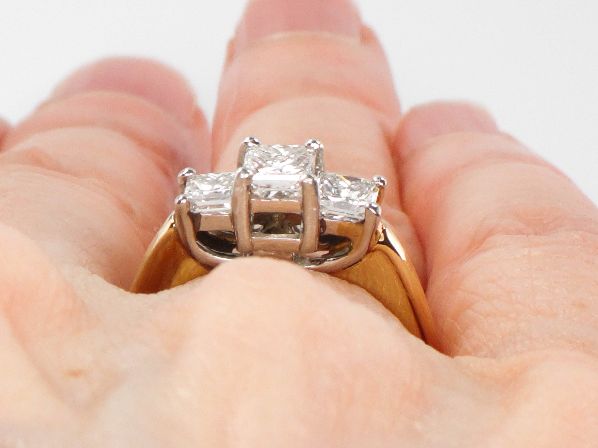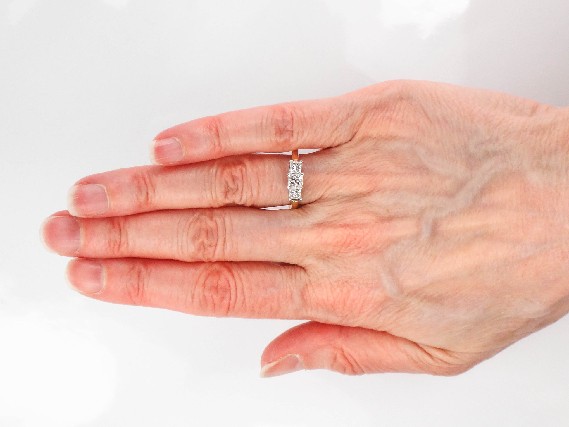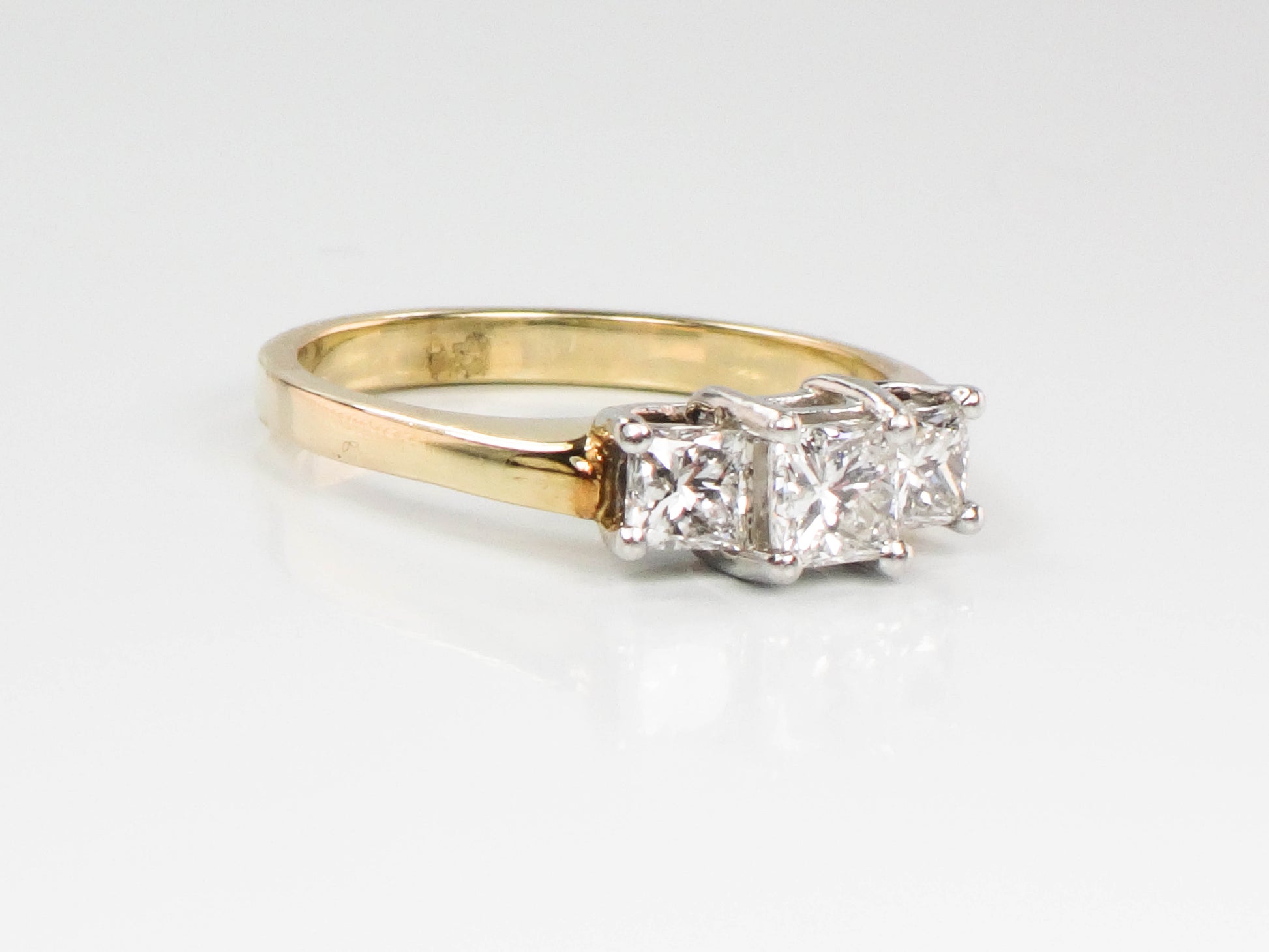This Vintage Three Stone Diamond Engagement Ring is beautiful! It features three square, also known as princess cut, diamonds in a simple and elegant design. The ring dates to approximately 2000. The center diamond weighs approximately .40 carats, H-I color, I1 clarity and .20 carats on each side, H-I color, SI1-SI2 clarity. There is approximately .80 carats of diamonds in total. The top of the ring is white gold where the diamonds are set and the band is yellow gold. The ring is unmarked and tests for 14k gold (not plated or filled). The rise of the ring is approximately 5.8 mm. This ring is very elegant with classic style. The diamonds sparkle! This ring could be worn as an engagement ring, promise ring, anniversary ring or right hand ring. It is very lovely!