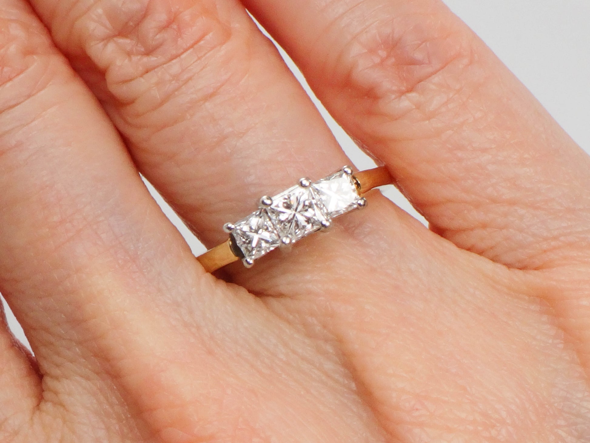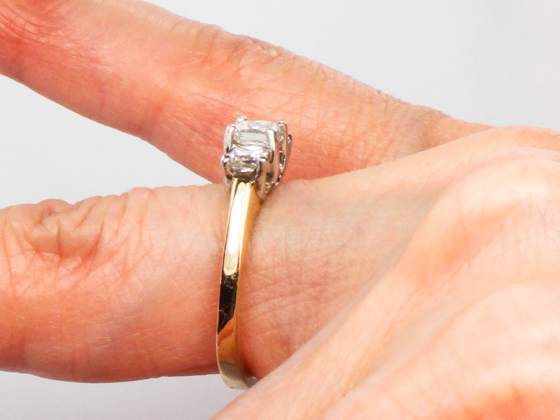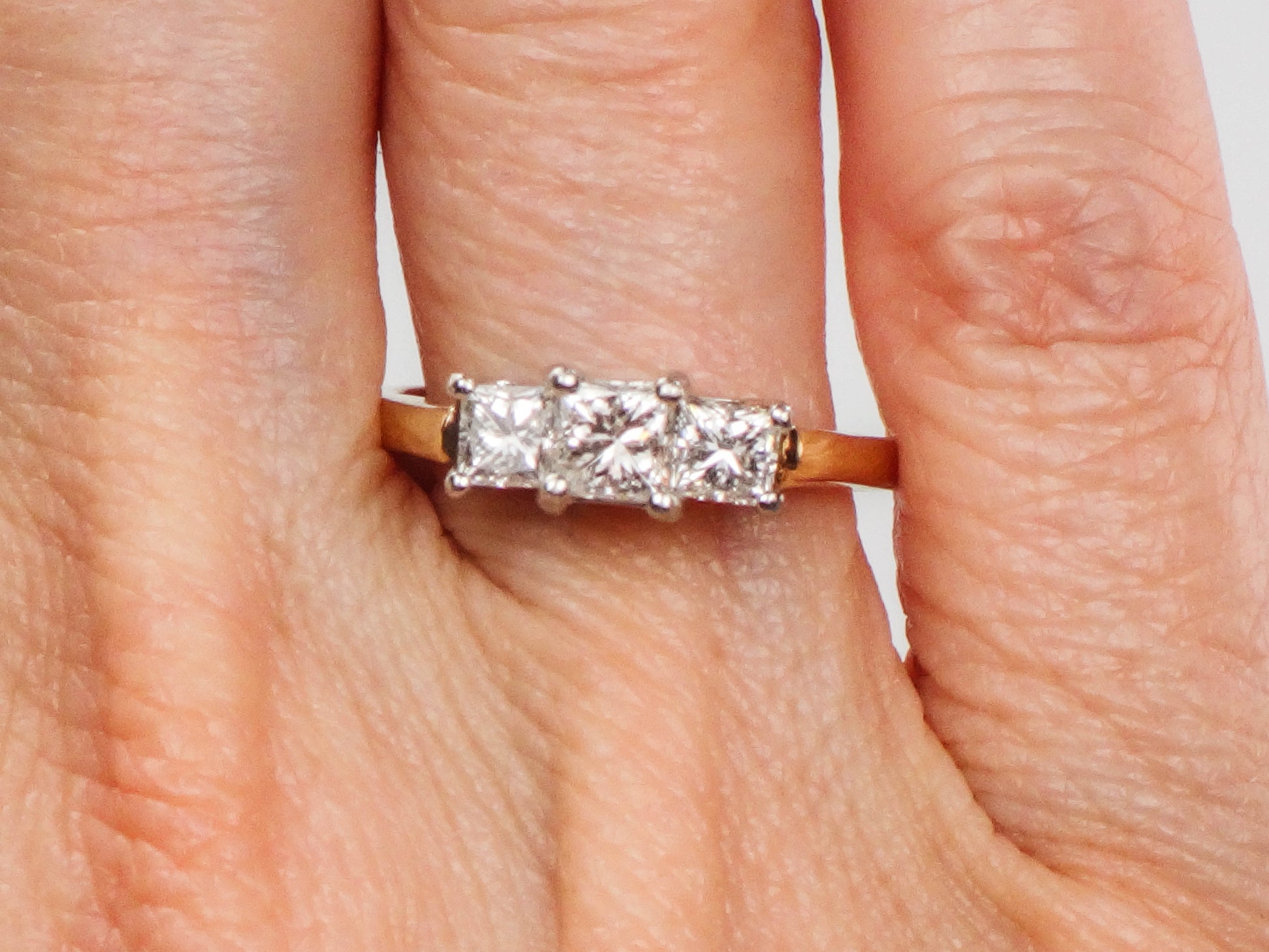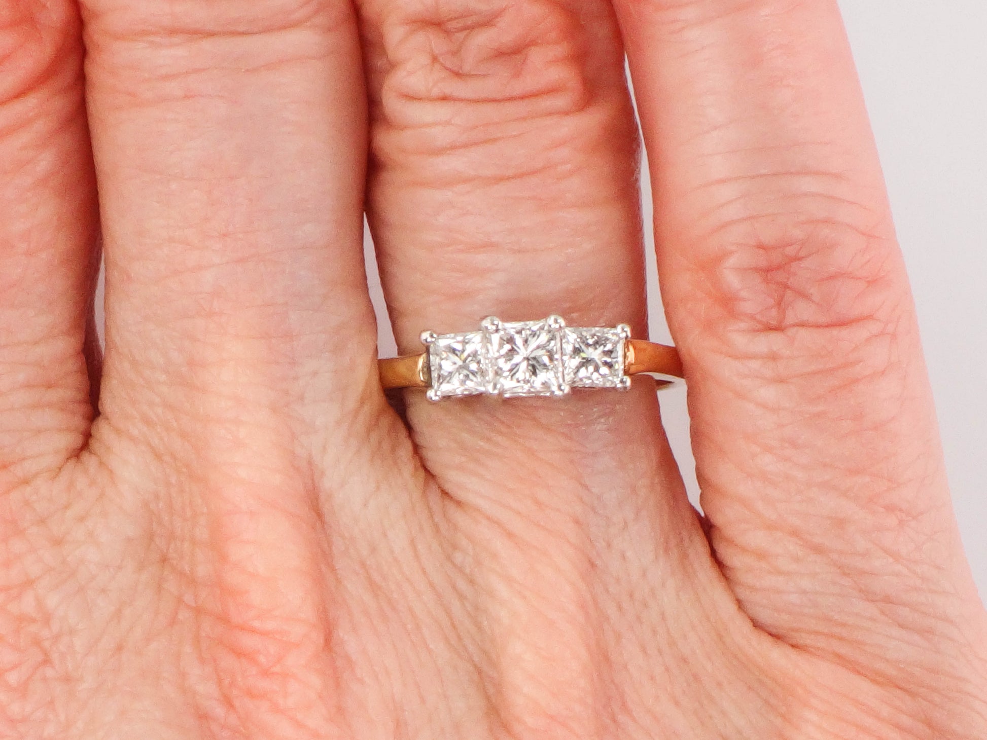 This Vintage Three Stone Diamond Engagement Ring is beautiful! It features three square, also known as princess cut, diamonds in a simple and elegant design. The ring dates to approximately 2000. The center diamond weighs approximately .40 carats, H-I color, I1 clarity and .20 carats on each side, H-I color, SI1-SI2 clarity. There is approximately .80 carats of diamonds in total. The top of the ring is white gold where the diamonds are set and the band is yellow gold. The ring is unmarked and tests for 14k gold (not plated or filled). The rise of the ring is approximately 5.8 mm. This ring is very elegant with classic style. The diamonds sparkle! This ring could be worn as an engagement ring, promise ring, anniversary ring or right hand ring. It is very lovely!