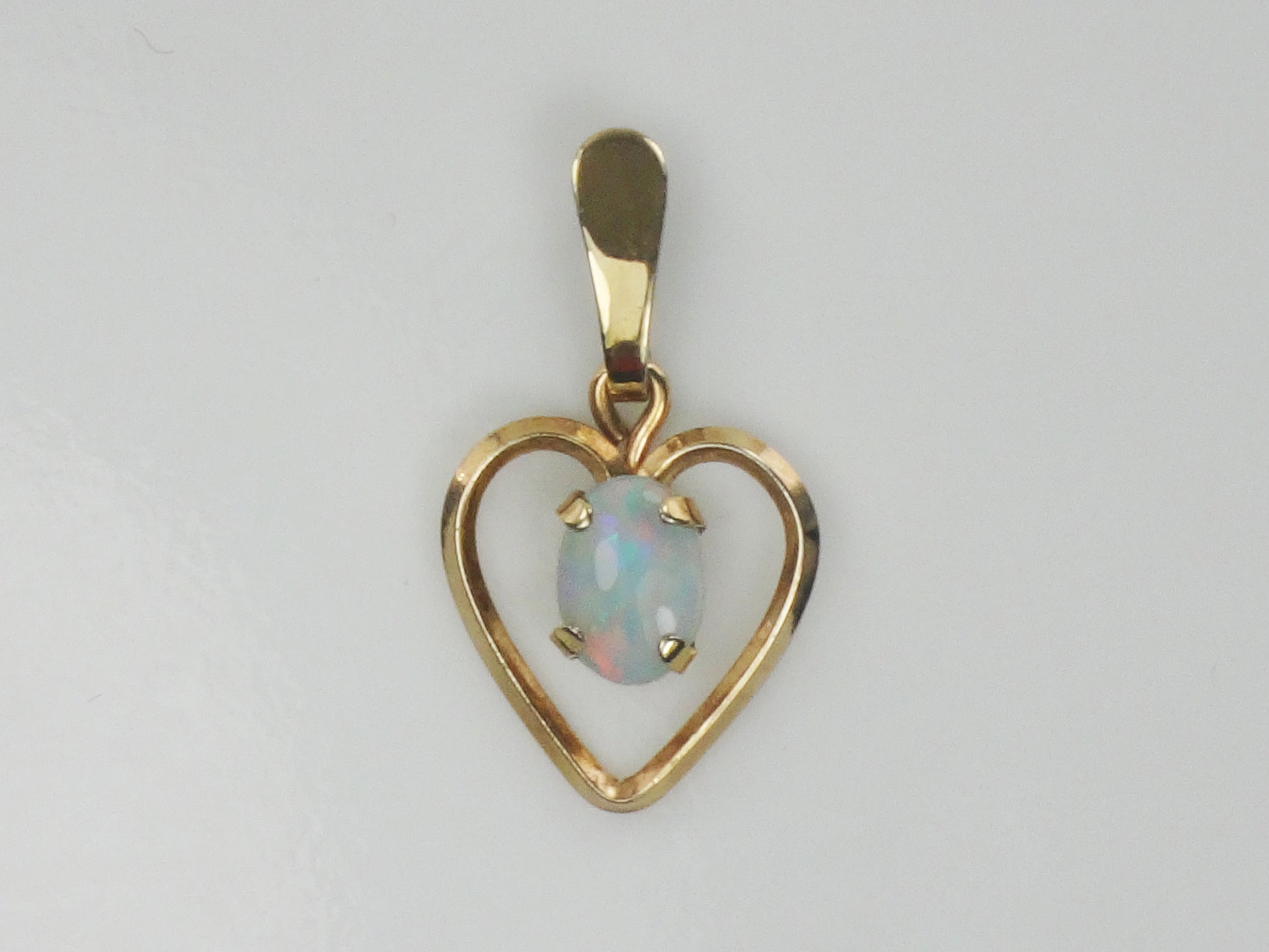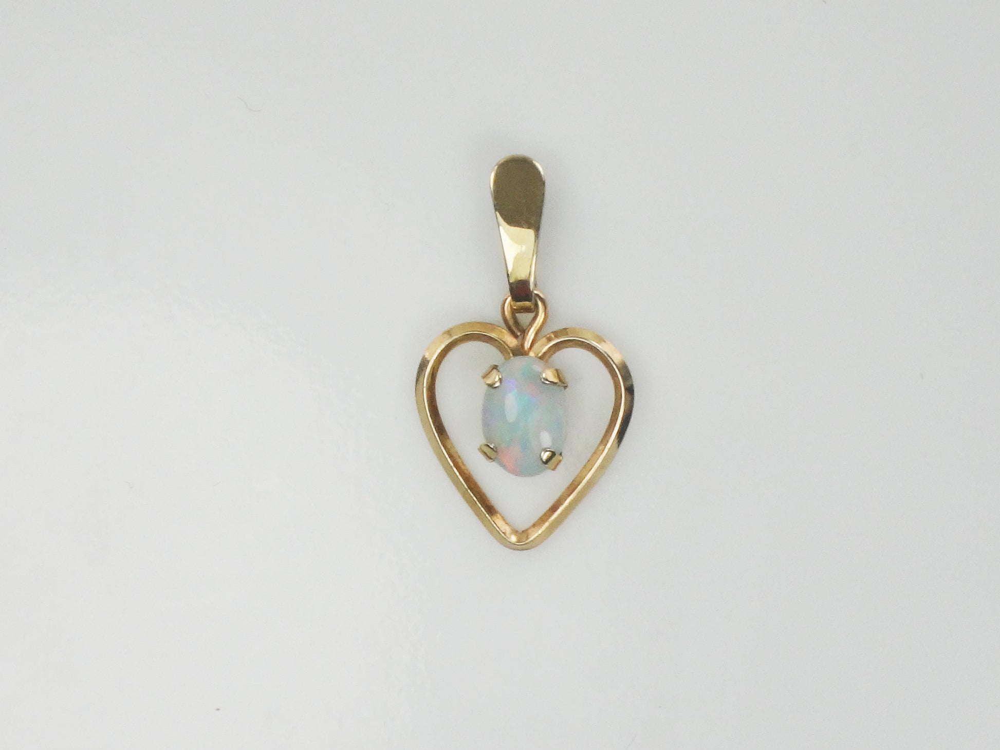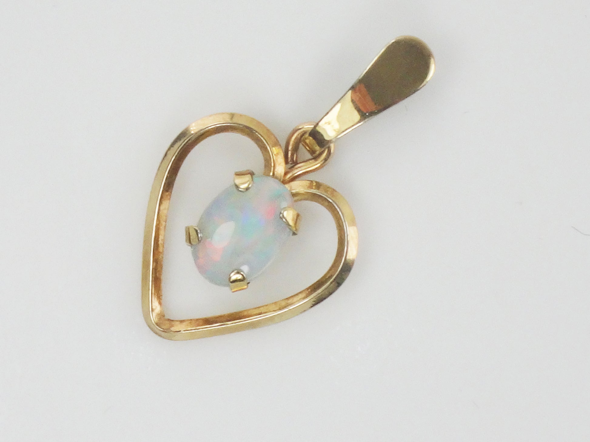 This Vintage Gold Tone Natural Opal Heart Pendant is stunning! The opal has predominantly blue color with flashes of pink and measures approximately 5.0 x 7.2 mm. It is prong set in a gold colored (not gold) open heart setting. The setting measures approximately 22.5 mm north to south including the bale x 12.75 mm east to west. The pendant is not marked. Opal is the birthstone for October. This classic style will go with anything and can be worn on the chain of your choice, alone or stacked with others. It would make a lovely gift or a nice treat for yourself!