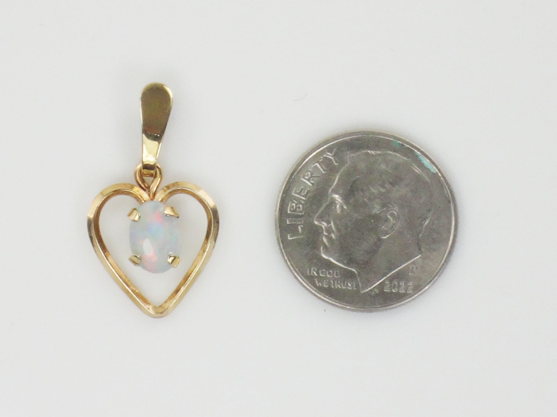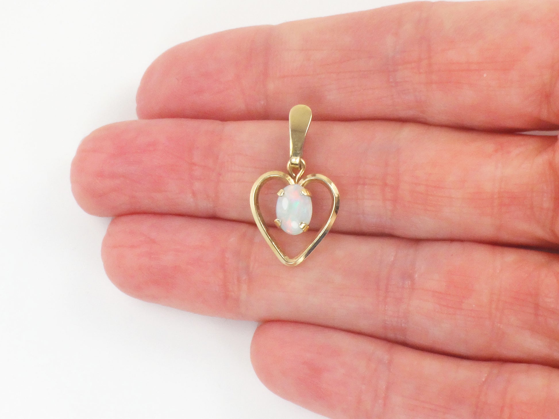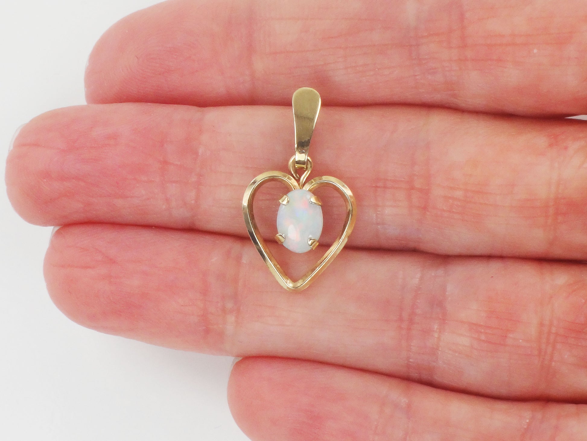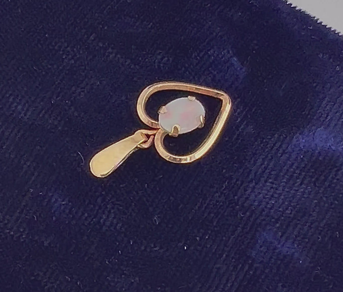 This Vintage Gold Tone Natural Opal Heart Pendant is stunning! The opal has predominantly blue color with flashes of pink and measures approximately 5.0 x 7.2 mm. It is prong set in a gold colored (not gold) open heart setting. The setting measures approximately 22.5 mm north to south including the bale x 12.75 mm east to west. The pendant is not marked. Opal is the birthstone for October. This classic style will go with anything and can be worn on the chain of your choice, alone or stacked with others. It would make a lovely gift or a nice treat for yourself!